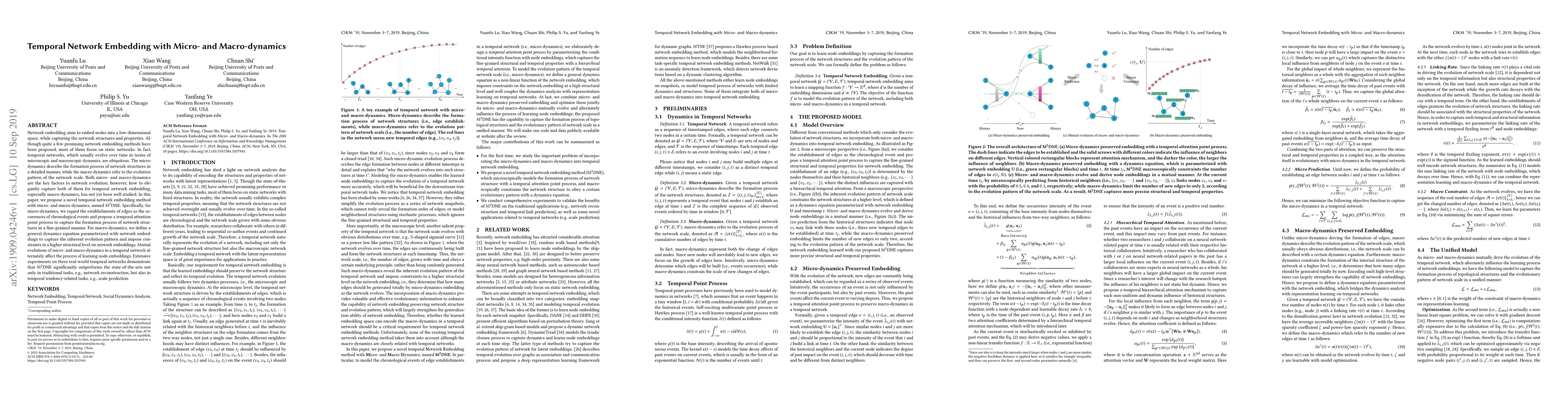 Network embedding aims to embed nodes into a low-dimensional space, while capturing the network structures and properties. Although quite a few promising network embedding methods have been proposed, most of them focus on static networks. In fact, temporal networks, which usually evolve over time in terms of microscopic and macroscopic dynamics, are ubiquitous. The micro-dynamics describe the formation process of network structures in a detailed manner, while the macro-dynamics refer to the evolution pattern of the network scale. Both micro- and macro-dynamics are the key factors to network evolution; however, how to elegantly capture both of them for temporal network embedding, especially macro-dynamics, has not yet been well studied. In this paper, we propose a novel temporal network embedding method with micro- and macro-dynamics, named $\rm{M^2DNE}$. Specifically, for micro-dynamics, we regard the establishments of edges as the occurrences of chronological events and propose a temporal attention point process to capture the formation process of network structures in a fine-grained manner. For macro-dynamics, we define a general dynamics equation parameterized with network embeddings to capture the inherent evolution pattern and impose constraints in a higher structural level on network embeddings. Mutual evolutions of micro- and macro-dynamics in a temporal network alternately affect the process of learning node embeddings. Extensive experiments on three real-world temporal networks demonstrate that $\rm{M^2DNE}$ significantly outperforms the state-of-the-arts not only in traditional tasks, e.g., network reconstruction, but also in temporal tendency-related tasks, e.g., scale prediction.