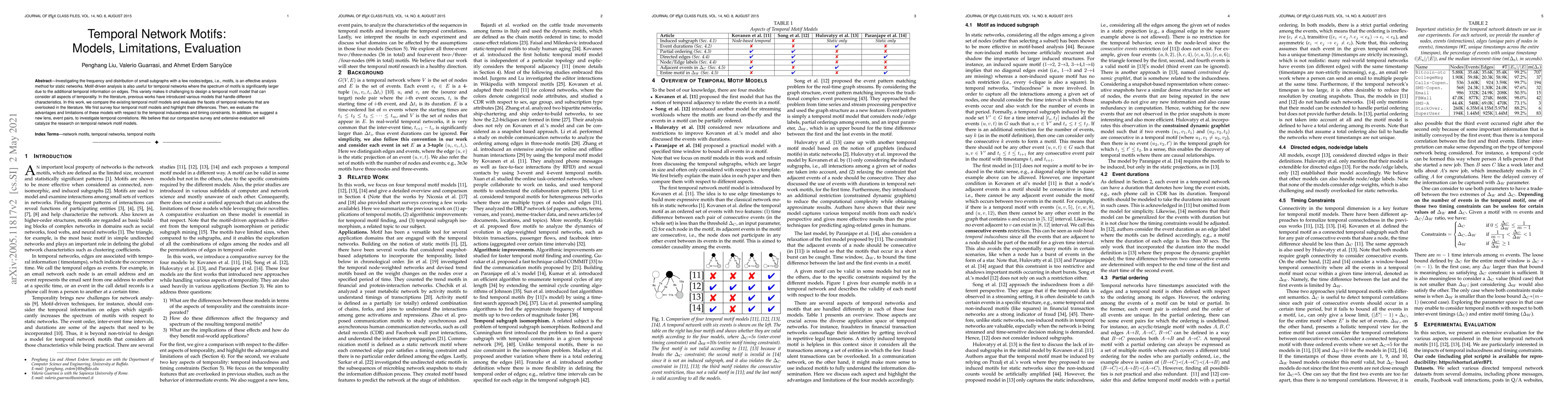 This paper surveys four existing temporal motif models, comparing their approaches and identifying their limitations regarding temporal inducedness and timing constraints. It proposes a new method, event pairs, to better capture temporal correlations, aiming to spur further research in this area.