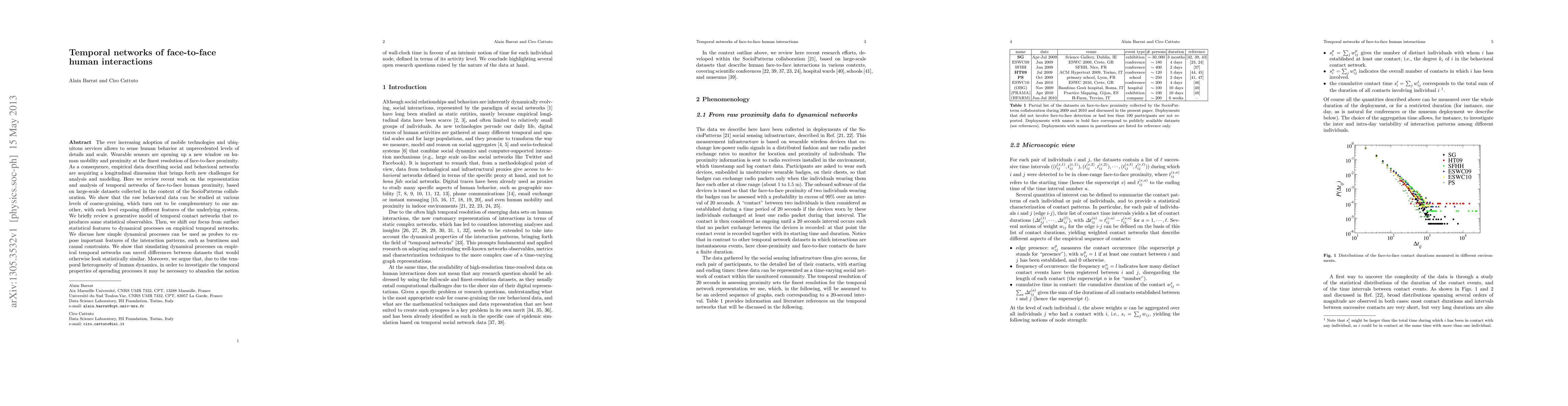 This paper reviews the analysis of temporal networks derived from large-scale wearable sensor data capturing human face-to-face interactions. It discusses how different levels of data coarse-graining reveal distinct features of social dynamics and highlights the importance of intrinsic time measures over wall-clock time to better understand spreading processes in these networks.