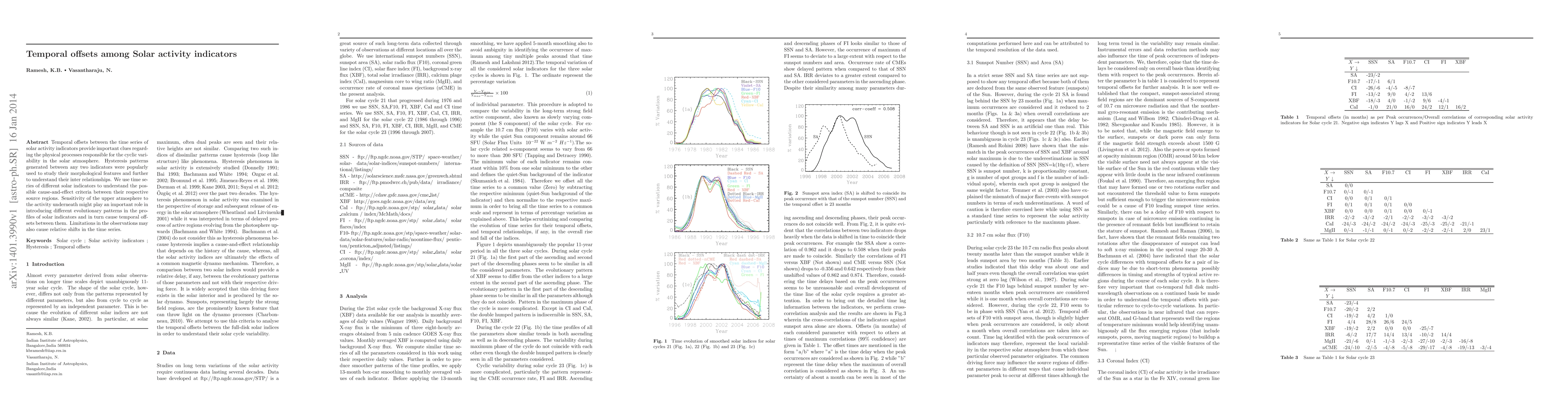 Temporal offsets between the time series of solar activity indicators provide important clues regarding the physical processes responsible for the cyclic variability in the solar atmosphere. Hysteresis patterns generated between any two indicators were popularly used to study their morphological features and further to understand their inter relationships. We use time series of different solar indicators to understand the possible cause-and-effect criteria between their respective source regions. Sensitivity of the upper atmosphere to the activity underneath might play an important role in introducing different evolutionary patterns in the profiles of solar indicators and in turn cause temporal offsets between them. Limitations in the observations may also cause relative shifts in the time series.