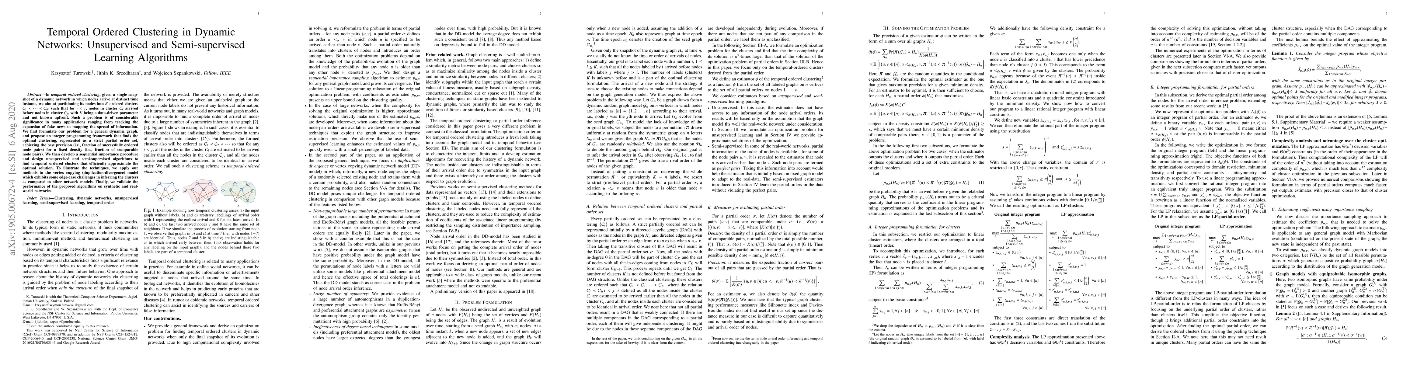 In temporal ordered clustering, given a single snapshot of a dynamic network