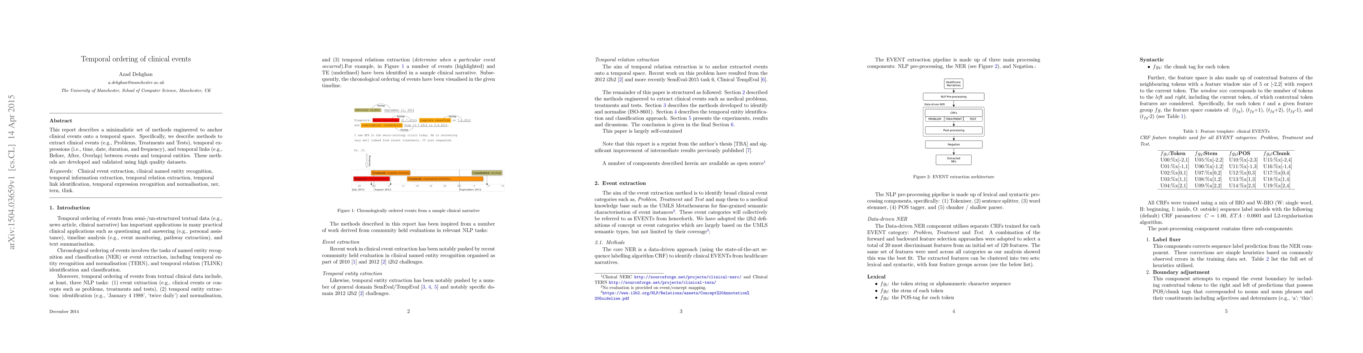 This report describes a minimalistic set of methods engineered to anchor clinical events onto a temporal space. Specifically, we describe methods to extract clinical events (e.g., Problems, Treatments and Tests), temporal expressions (i.e., time, date, duration, and frequency), and temporal links (e.g., Before, After, Overlap) between events and temporal entities. These methods are developed and validated using high quality datasets.
