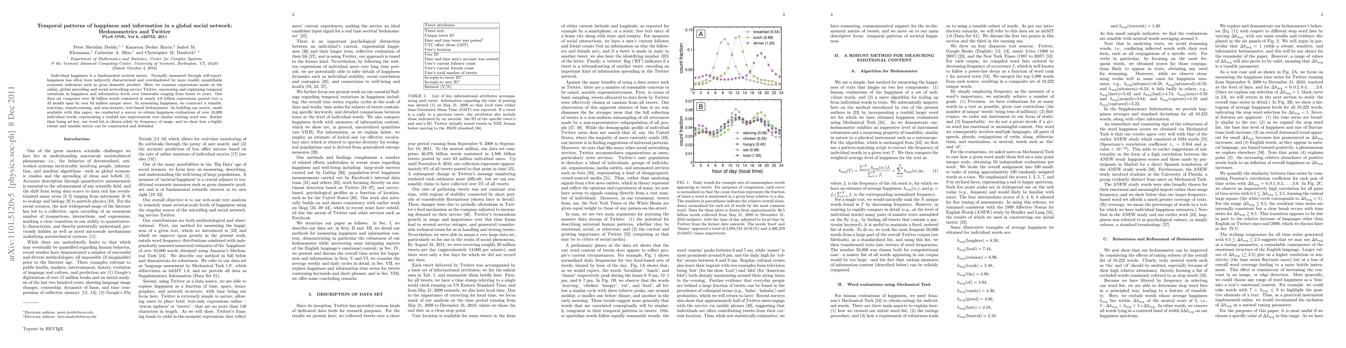 This study employs a hedonometric approach to analyze over 46 billion Twitter words from 63 million users over 33 months, revealing temporal patterns in happiness and information levels. The research constructs a robust happiness metric based on a survey of 10,000 words, significantly improving upon existing word sets.