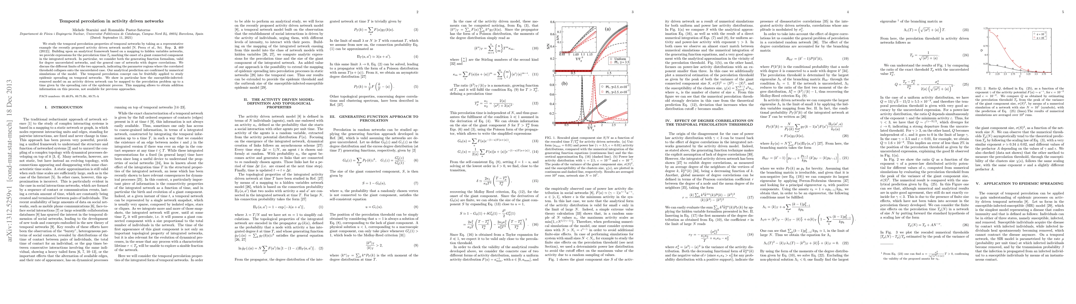 The paper presents an analytical approach for temporal percolation in activity-driven networks, mapping epidemic spreading to a percolation problem and providing expressions for percolation time and giant component size.
