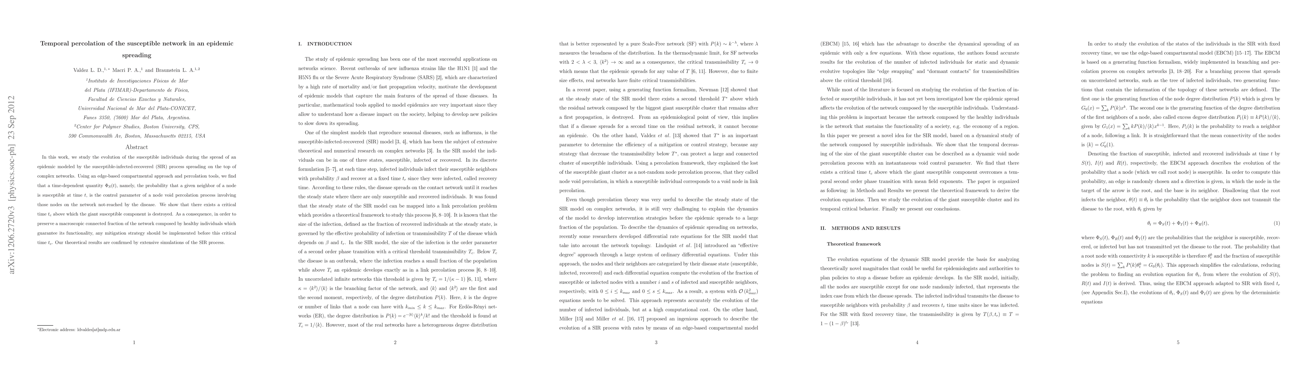 In this work, we study the evolution of the susceptible individuals during the spread of an epidemic modeled by the susceptible-infected-recovered (SIR) process spreading on the top of complex networks. Using an edge-based compartmental approach and percolation tools, we find that a time-dependent quantity $\Phi_S(t)$, namely, the probability that a given neighbor of a node is susceptible at time $t$, is the control parameter of a node void percolation process involving those nodes on the network not-reached by the disease. We show that there exists a critical time $t_c$ above which the giant susceptible component is destroyed. As a consequence, in order to preserve a macroscopic connected fraction of the network composed by healthy individuals which guarantee its functionality, any mitigation strategy should be implemented before this critical time $t_c$. Our theoretical results are confirmed by extensive simulations of the SIR process.
