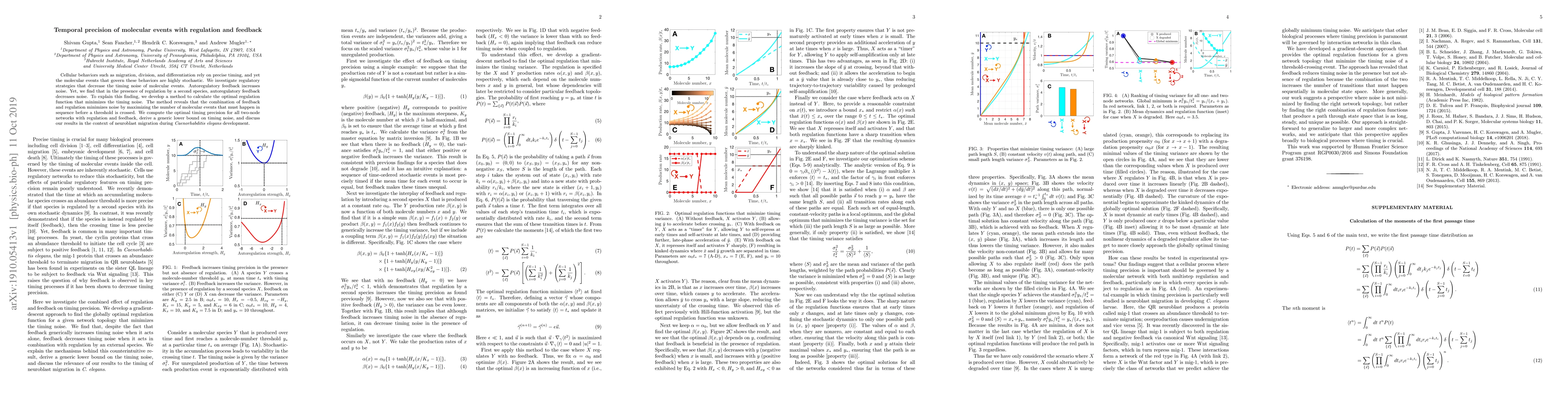 Cellular behaviors such as migration, division, and differentiation rely on precise timing, and yet the molecular events that govern these behaviors are highly stochastic. We investigate regulatory strategies that decrease the timing noise of molecular events. Autoregulatory feedback increases noise. Yet, we find that in the presence of regulation by a second species, autoregulatory feedback decreases noise. To explain this finding, we develop a method to calculate the optimal regulation function that minimizes the timing noise. The method reveals that the combination of feedback and regulation minimizes noise by maximizing the number of molecular events that must happen in sequence before a threshold is crossed. We compute the optimal timing precision for all two-node networks with regulation and feedback, derive a generic lower bound on timing noise, and discuss our results in the context of neuroblast migration during Caenorhabditis elegans development.