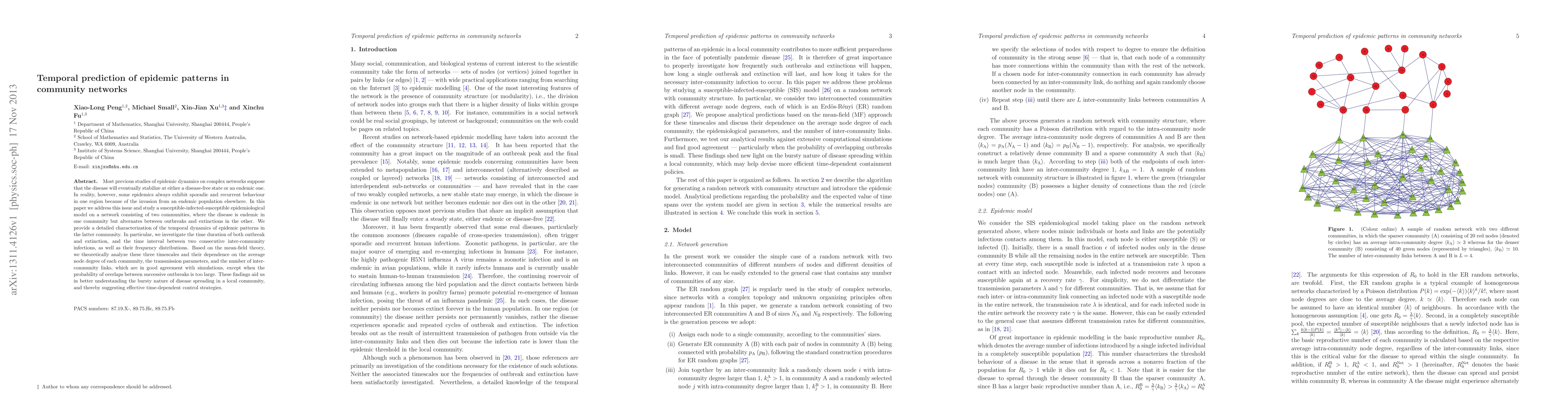 This study analyzes epidemic patterns in a community network with two communities, one endemic and the other experiencing sporadic outbreaks. It finds that outbreak duration, extinction time, and inter-community infection intervals can be predicted based on average node degree, transmission parameters, and community links.