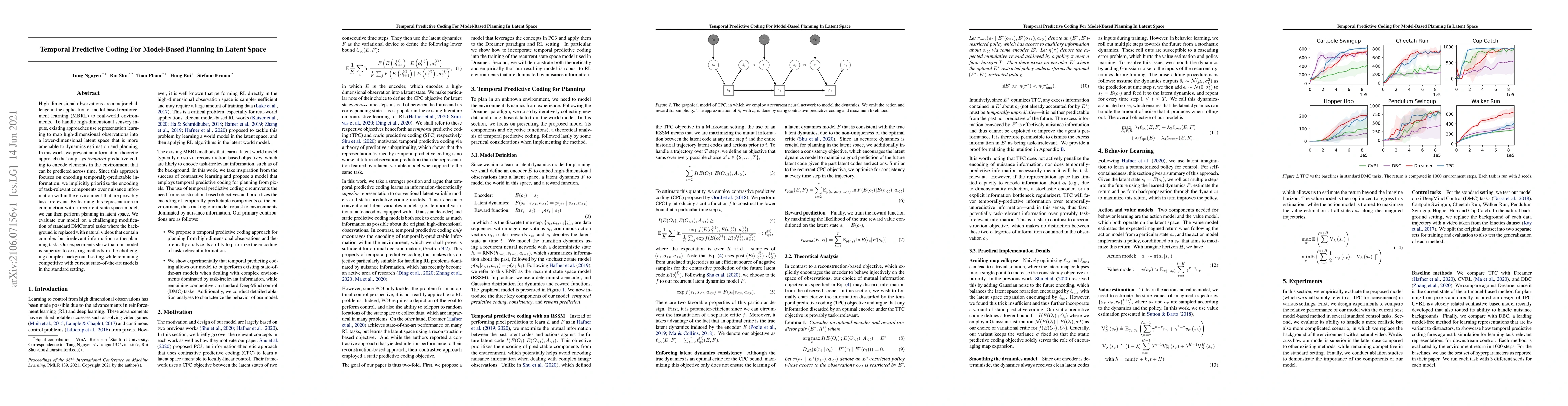 High-dimensional observations are a major challenge in the application of model-based reinforcement learning (MBRL) to real-world environments. To handle high-dimensional sensory inputs, existing approaches use representation learning to map high-dimensional observations into a lower-dimensional latent space that is more amenable to dynamics estimation and planning. In this work, we present an information-theoretic approach that employs temporal predictive coding to encode elements in the environment that can be predicted across time. Since this approach focuses on encoding temporally-predictable information, we implicitly prioritize the encoding of task-relevant components over nuisance information within the environment that are provably task-irrelevant. By learning this representation in conjunction with a recurrent state space model, we can then perform planning in latent space. We evaluate our model on a challenging modification of standard DMControl tasks where the background is replaced with natural videos that contain complex but irrelevant information to the planning task. Our experiments show that our model is superior to existing methods in the challenging complex-background setting while remaining competitive with current state-of-the-art models in the standard setting.