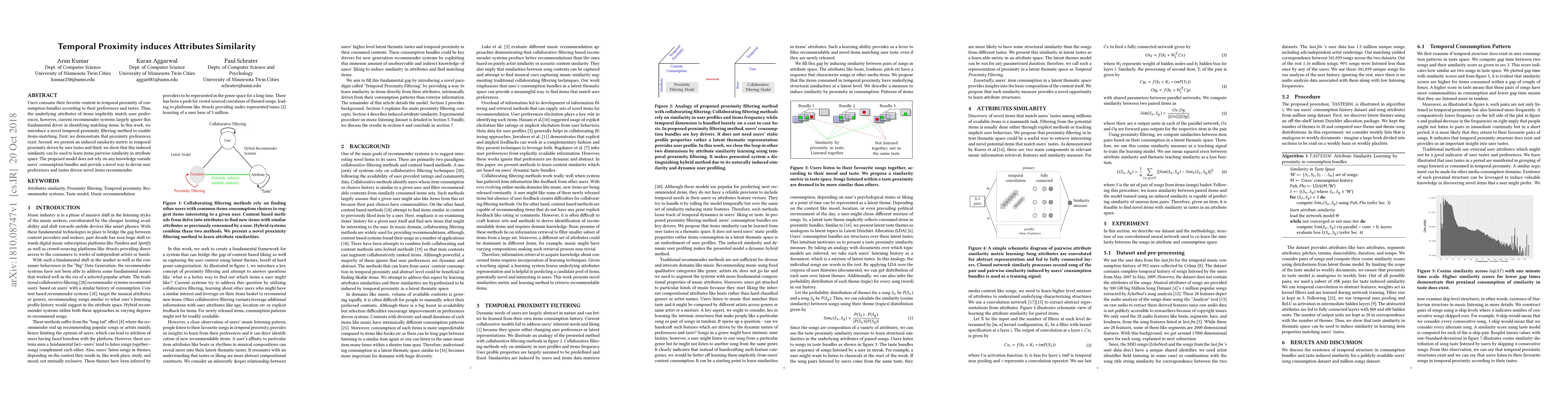 Users consume their favorite content in temporal proximity of consumption bundles according to their preferences and tastes. Thus, the underlying attributes of items implicitly match user preferences, however, current recommender systems largely ignore this fundamental driver in identifying matching items. In this work, we introduce a novel temporal proximity filtering method to enable items-matching. First, we demonstrate that proximity preferences exist. Second, we present an induced similarity metric in temporal proximity driven by user tastes and third, we show that this induced similarity can be used to learn items pairwise similarity in attribute space. The proposed model does not rely on any knowledge outside users' consumption bundles and provide a novel way to devise user preferences and tastes driven novel items recommender.