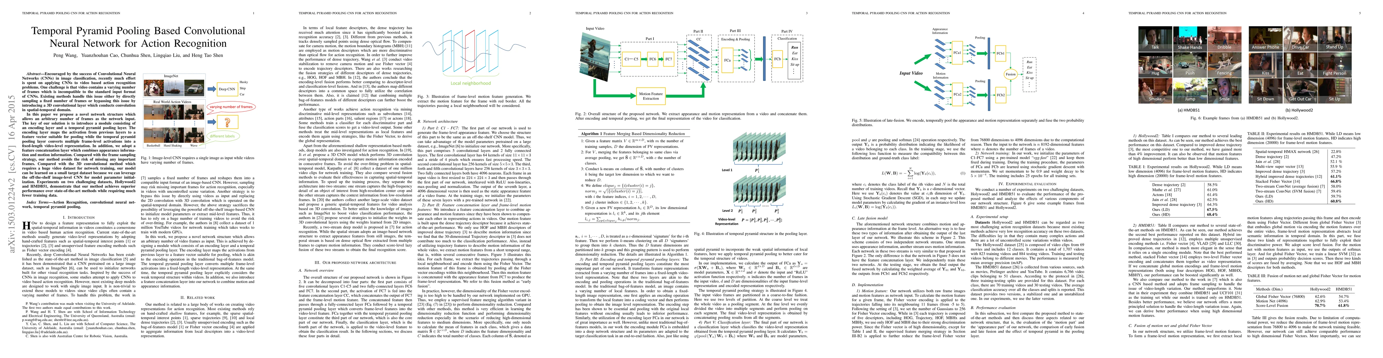 This paper proposes a novel CNN structure with temporal pyramid pooling and an encoding layer to handle varying frame numbers in videos for action recognition. The method combines appearance and motion information without fixed frame sampling, achieving superior performance on datasets with fewer training data compared to 3D convolutional methods.