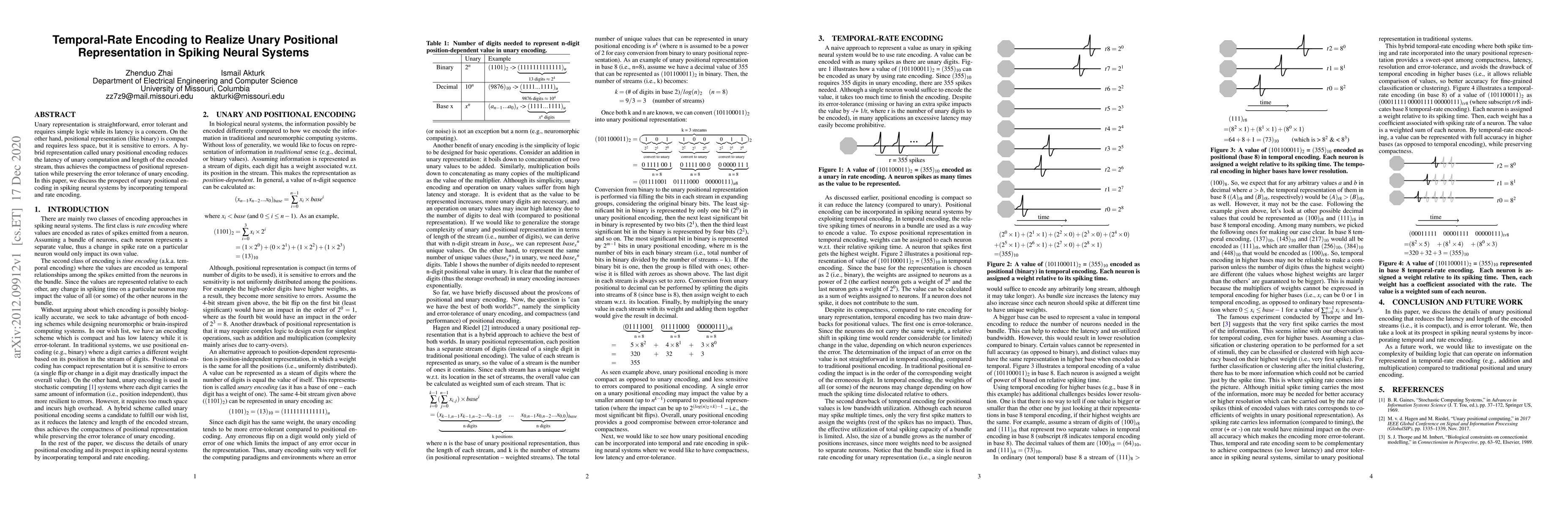 This paper explores the use of temporal-rate encoding to implement a hybrid unary positional representation in spiking neural systems, aiming to combine the error tolerance of unary encoding with the compactness of positional encoding, thereby reducing latency and stream length. The proposed method seeks to enhance the efficiency and reliability of neural computations.