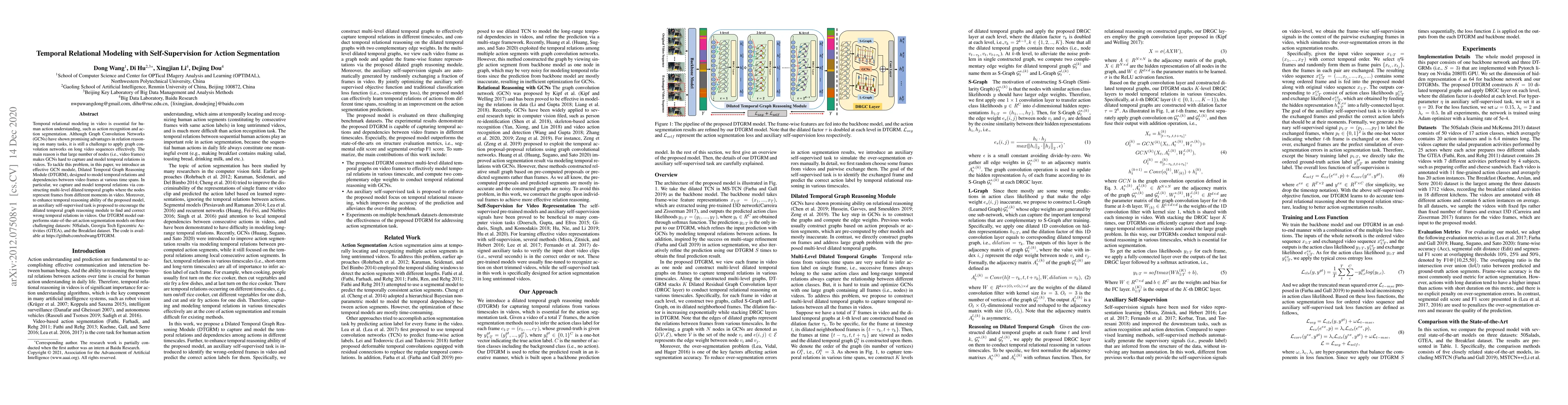 This paper introduces a Dilated Temporal Graph Reasoning Module (DTGRM) to enhance temporal relational modeling in long video sequences, addressing the challenge of applying Graph Convolutional Networks (GCNs) to large numbers of video frames. The proposed self-supervised auxiliary task further improves temporal reasoning, achieving superior performance on action segmentation in three datasets.