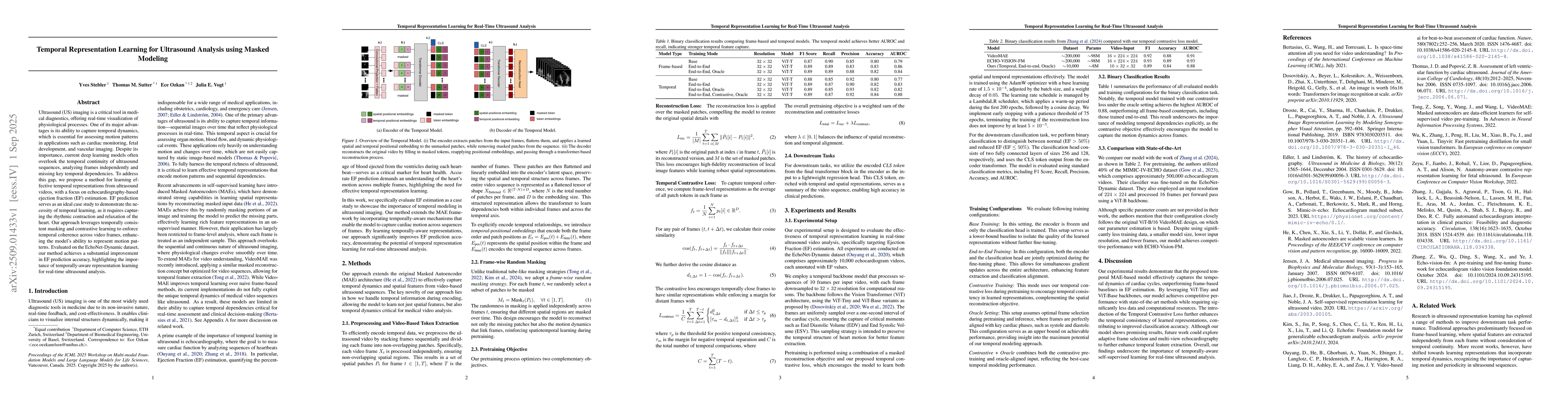 Ultrasound (US) imaging is a critical tool in medical diagnostics, offering real-time visualization of physiological processes. One of its major advantages is its ability to capture temporal dynamics, which is essential for assessing motion patterns in applications such as cardiac monitoring, fetal development, and vascular imaging. Despite its importance, current deep learning models often overlook the temporal continuity of ultrasound sequences, analyzing frames independently and missing key temporal dependencies. To address this gap, we propose a method for learning effective temporal representations from ultrasound videos, with a focus on echocardiography-based ejection fraction (EF) estimation. EF prediction serves as an ideal case study to demonstrate the necessity of temporal learning, as it requires capturing the rhythmic contraction and relaxation of the heart. Our approach leverages temporally consistent masking and contrastive learning to enforce temporal coherence across video frames, enhancing the model's ability to represent motion patterns. Evaluated on the EchoNet-Dynamic dataset, our method achieves a substantial improvement in EF prediction accuracy, highlighting the importance of temporally-aware representation learning for real-time ultrasound analysis.