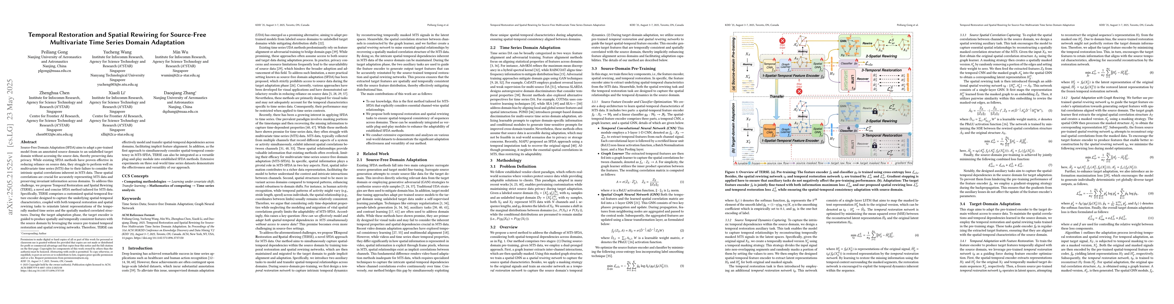 The research proposes TERSE, a Source-Free Domain Adaptation method for multivariate time series data, which includes a spatial-temporal feature encoder and tasks for temporal restoration and spatial rewiring to maintain domain adaptation without source data access.