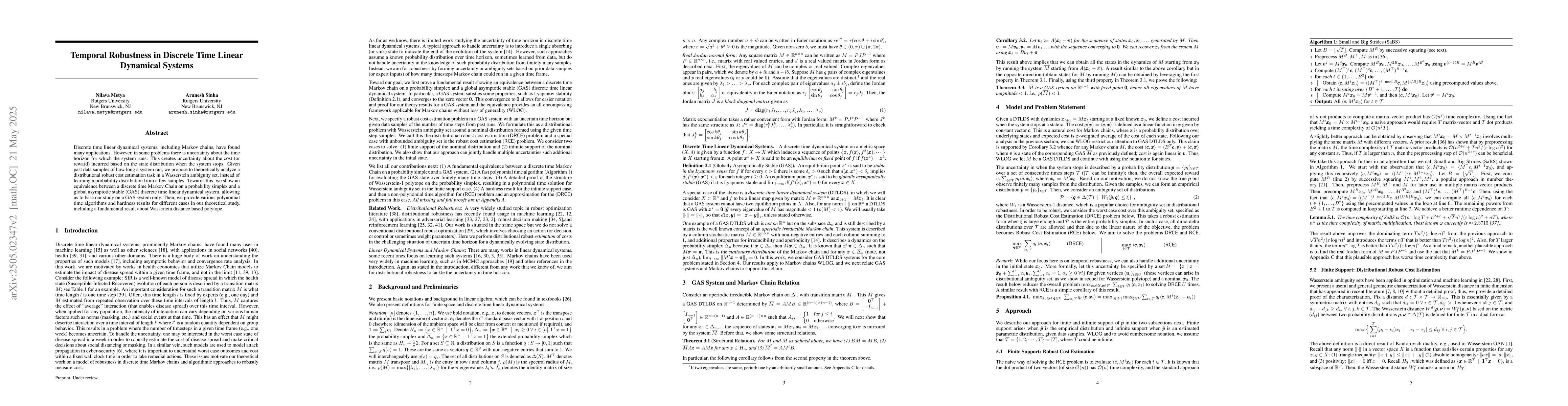 Discrete time linear dynamical systems, including Markov chains, have found many applications. However, in some problems, there is uncertainty about the time horizon for which the system runs. This creates uncertainty about the cost (or reward) incurred based on the state distribution when the system stops. Given past data samples of how long a system ran, we propose to theoretically analyze a distributional robust cost estimation task in a Wasserstein ambiguity set, instead of learning a probability distribution from a few samples. Towards this, we show an equivalence between a discrete time Markov Chain on a probability simplex and a global asymptotic stable (GAS) discrete time linear dynamical system, allowing us to base our study on a GAS system only. Then, we provide various polynomial time algorithms and hardness results for different cases in our theoretical study, including a fundamental result about Wasserstein distance based polytope.