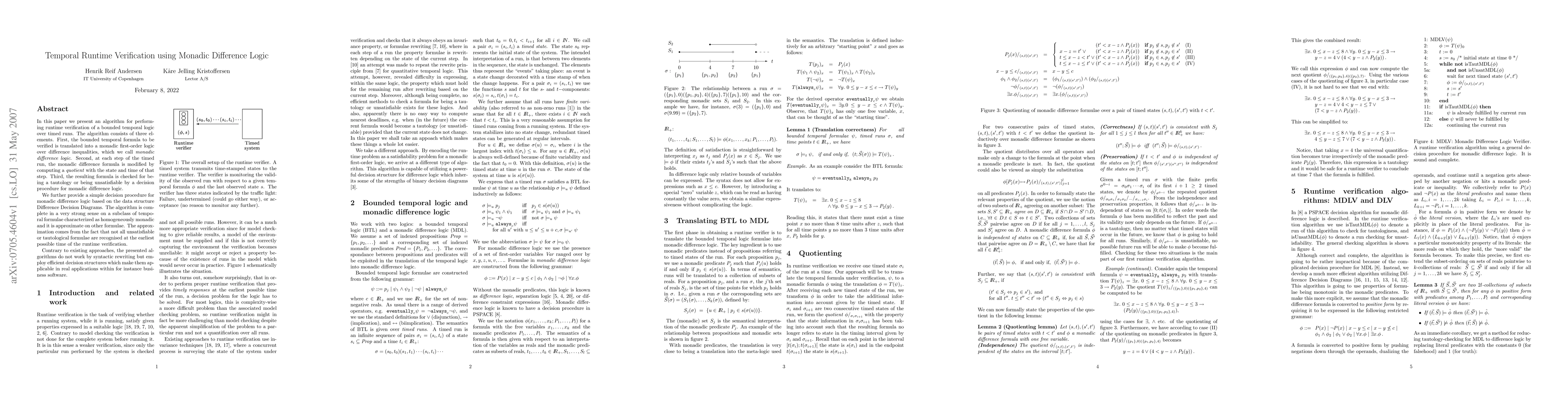 In this paper we present an algorithm for performing runtime verification of a bounded temporal logic over timed runs. The algorithm consists of three elements. First, the bounded temporal formula to be verified is translated into a monadic first-order logic over difference inequalities, which we call monadic difference logic. Second, at each step of the timed run, the monadic difference formula is modified by computing a quotient with the state and time of that step. Third, the resulting formula is checked for being a tautology or being unsatisfiable by a decision procedure for monadic difference logic. We further provide a simple decision procedure for monadic difference logic based on the data structure Difference Decision Diagrams. The algorithm is complete in a very strong sense on a subclass of temporal formulae characterized as homogeneously monadic and it is approximate on other formulae. The approximation comes from the fact that not all unsatisfiable or tautological formulae are recognised at the earliest possible time of the runtime verification. Contrary to existing approaches, the presented algorithms do not work by syntactic rewriting but employ efficient decision structures which make them applicable in real applications within for instance business software.