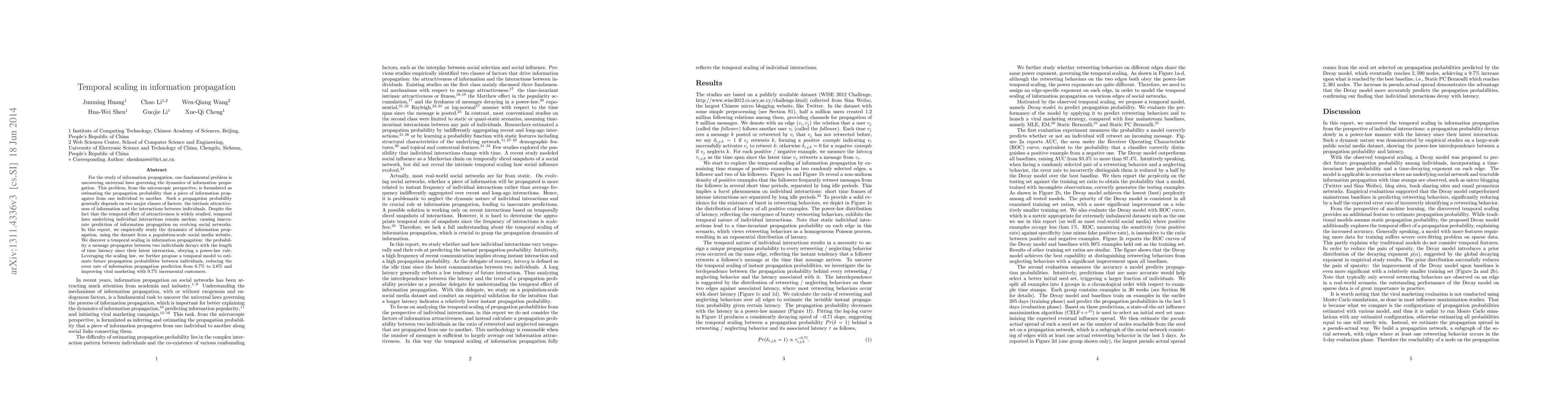 This paper investigates temporal scaling in information propagation on social networks, discovering that the probability of information spread decays with power-law over time since the last interaction. The proposed temporal model significantly reduces prediction errors and enhances viral marketing effectiveness.