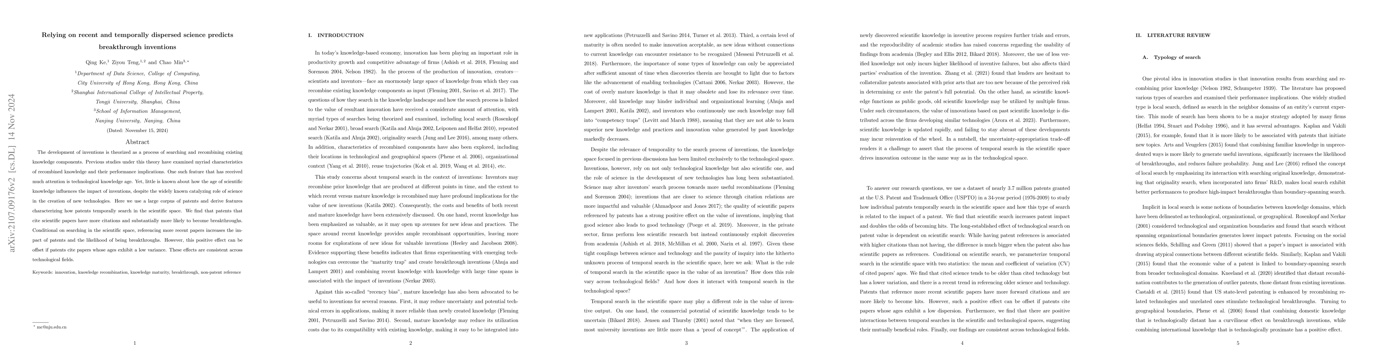 Patents that cite recent scientific papers have more citations and a higher likelihood of being breakthroughs, according to this study. This suggests that searching the scientific space can predict breakthrough inventions and increase their impact.