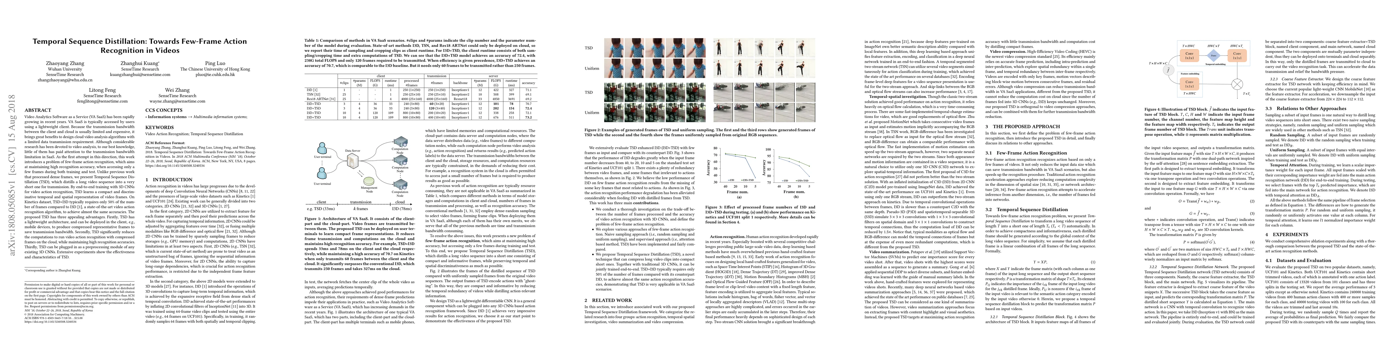 Video Analytics Software as a Service (VA SaaS) has been rapidly growing in recent years. VA SaaS is typically accessed by users using a lightweight client. Because the transmission bandwidth between the client and cloud is usually limited and expensive, it brings great benefits to design cloud video analysis algorithms with a limited data transmission requirement. Although considerable research has been devoted to video analysis, to our best knowledge, little of them has paid attention to the transmission bandwidth limitation in SaaS. As the first attempt in this direction, this work introduces a problem of few-frame action recognition, which aims at maintaining high recognition accuracy, when accessing only a few frames during both training and test. Unlike previous work that processed dense frames, we present Temporal Sequence Distillation (TSD), which distills a long video sequence into a very short one for transmission. By end-to-end training with 3D CNNs for video action recognition, TSD learns a compact and discriminative temporal and spatial representation of video frames. On Kinetics dataset, TSD+I3D typically requires only 50\% of the number of frames compared to I3D, a state-of-the-art video action recognition algorithm, to achieve almost the same accuracies. The proposed TSD has three appealing advantages. Firstly, TSD has a lightweight architecture and can be deployed in the client, eg. mobile devices, to produce compressed representative frames to save transmission bandwidth. Secondly, TSD significantly reduces the computations to run video action recognition with compressed frames on the cloud, while maintaining high recognition accuracies. Thirdly, TSD can be plugged in as a preprocessing module of any existing 3D CNNs. Extensive experiments show the effectiveness and characteristics of TSD.