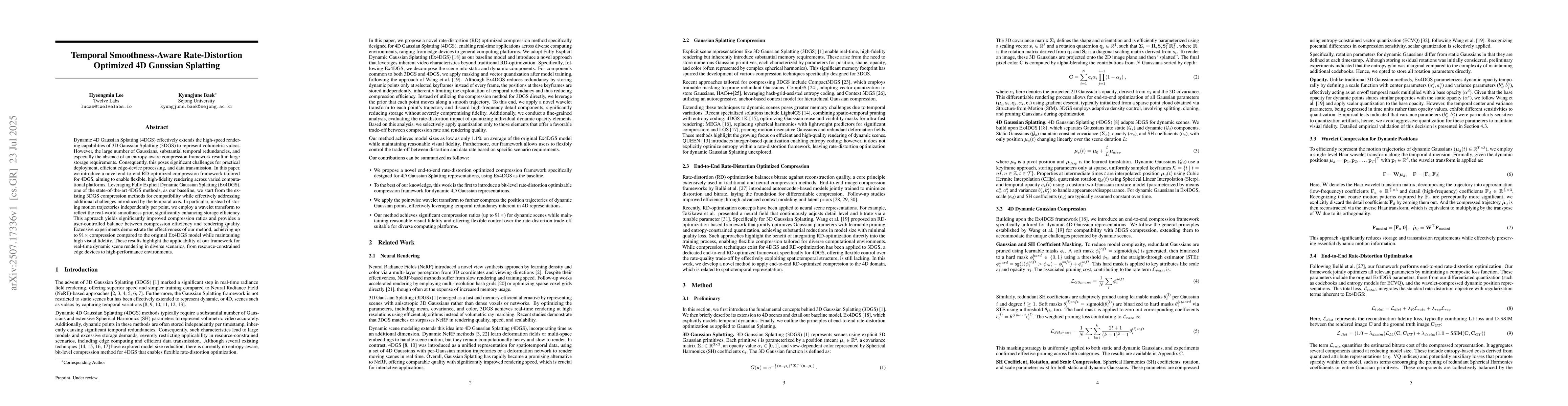 Dynamic 4D Gaussian Splatting (4DGS) effectively extends the high-speed rendering capabilities of 3D Gaussian Splatting (3DGS) to represent volumetric videos. However, the large number of Gaussians, substantial temporal redundancies, and especially the absence of an entropy-aware compression framework result in large storage requirements. Consequently, this poses significant challenges for practical deployment, efficient edge-device processing, and data transmission. In this paper, we introduce a novel end-to-end RD-optimized compression framework tailored for 4DGS, aiming to enable flexible, high-fidelity rendering across varied computational platforms. Leveraging Fully Explicit Dynamic Gaussian Splatting (Ex4DGS), one of the state-of-the-art 4DGS methods, as our baseline, we start from the existing 3DGS compression methods for compatibility while effectively addressing additional challenges introduced by the temporal axis. In particular, instead of storing motion trajectories independently per point, we employ a wavelet transform to reflect the real-world smoothness prior, significantly enhancing storage efficiency. This approach yields significantly improved compression ratios and provides a user-controlled balance between compression efficiency and rendering quality. Extensive experiments demonstrate the effectiveness of our method, achieving up to 91x compression compared to the original Ex4DGS model while maintaining high visual fidelity. These results highlight the applicability of our framework for real-time dynamic scene rendering in diverse scenarios, from resource-constrained edge devices to high-performance environments.