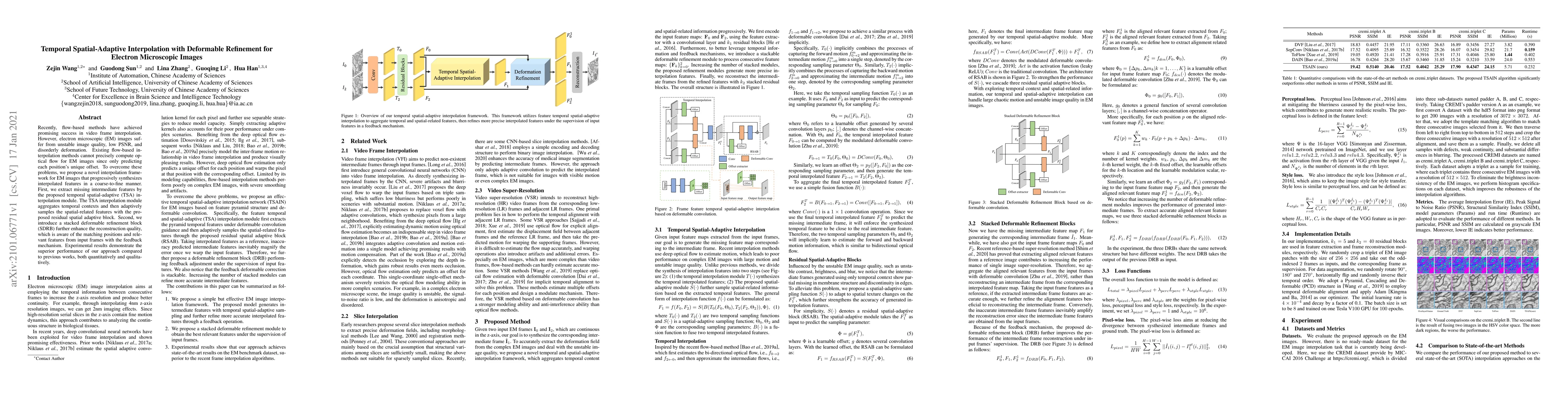 Recently, flow-based methods have achieved promising success in video frame interpolation. However, electron microscopic (EM) images suffer from unstable image quality, low PSNR, and disorderly deformation. Existing flow-based interpolation methods cannot precisely compute optical flow for EM images since only predicting each position's unique offset. To overcome these problems, we propose a novel interpolation framework for EM images that progressively synthesizes interpolated features in a coarse-to-fine manner. First, we extract missing intermediate features by the proposed temporal spatial-adaptive (TSA) interpolation module. The TSA interpolation module aggregates temporal contexts and then adaptively samples the spatial-related features with the proposed residual spatial adaptive block. Second, we introduce a stacked deformable refinement block (SDRB) further enhance the reconstruction quality, which is aware of the matching positions and relevant features from input frames with the feedback mechanism. Experimental results demonstrate the superior performance of our approach compared to previous works, both quantitatively and qualitatively.