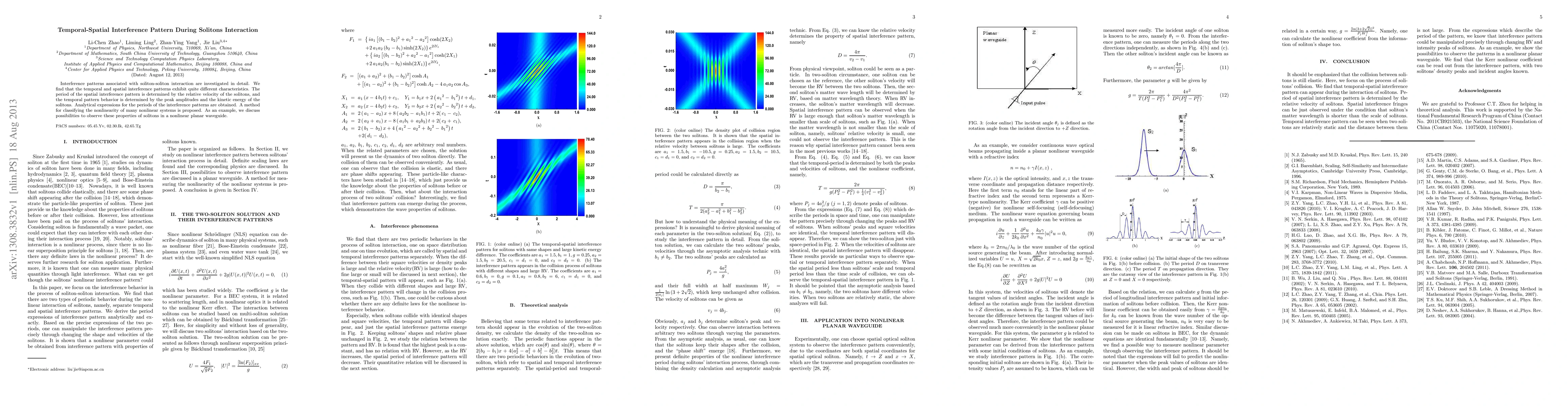 This paper investigates the distinct temporal and spatial interference patterns during soliton-soliton interactions, revealing that spatial patterns depend on soliton relative velocity while temporal patterns depend on peak amplitudes and kinetic energy. Analytical expressions for interference pattern periods are derived, and a method for classifying nonlinear systems is proposed, exemplified by potential observations in a nonlinear planar waveguide.