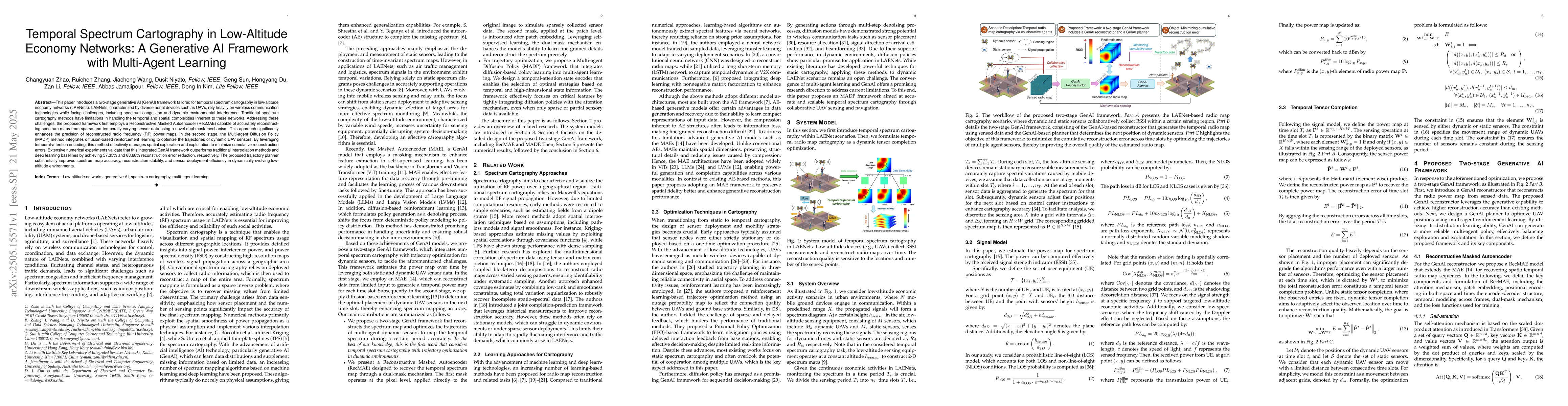 The research introduces a two-stage generative AI framework for temporal spectrum cartography in low-altitude economy networks (LAENets). It employs a Reconstructive Masked Autoencoder (RecMAE) for accurate reconstruction of spectrum maps from sparse, temporally varying sensor data, followed by a Multi-agent Diffusion Policy (MADP) method for optimizing UAV sensor trajectories using temporal-attention encoding.