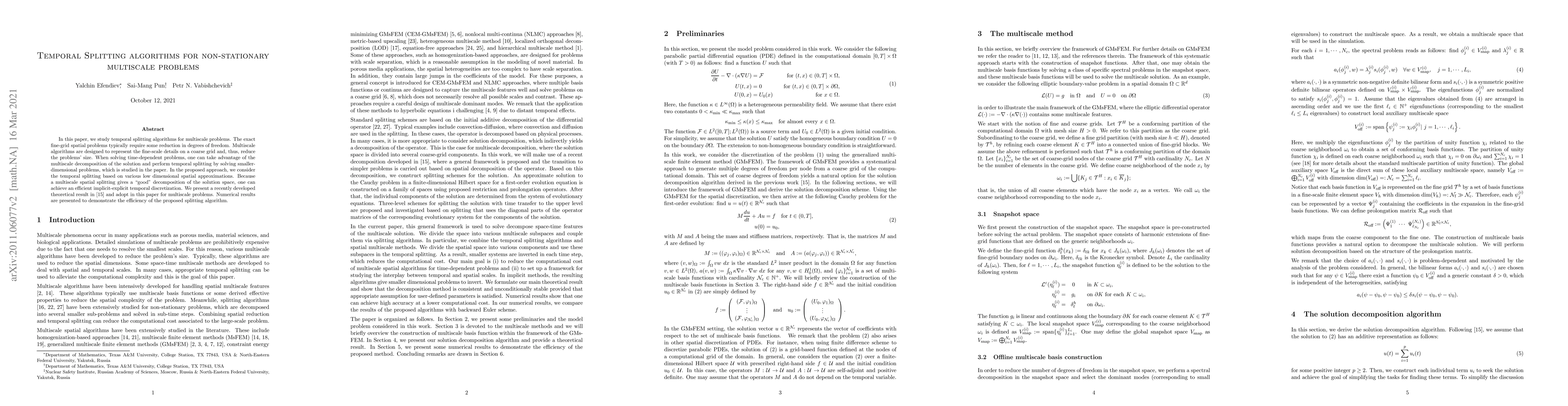 This paper investigates temporal splitting algorithms for solving non-stationary multiscale problems, leveraging multiscale decomposition to reduce degrees of freedom. The proposed approach uses an efficient implicit-explicit temporal discretization based on low-dimensional spatial approximations, supported by theoretical results and demonstrated through numerical efficiency.