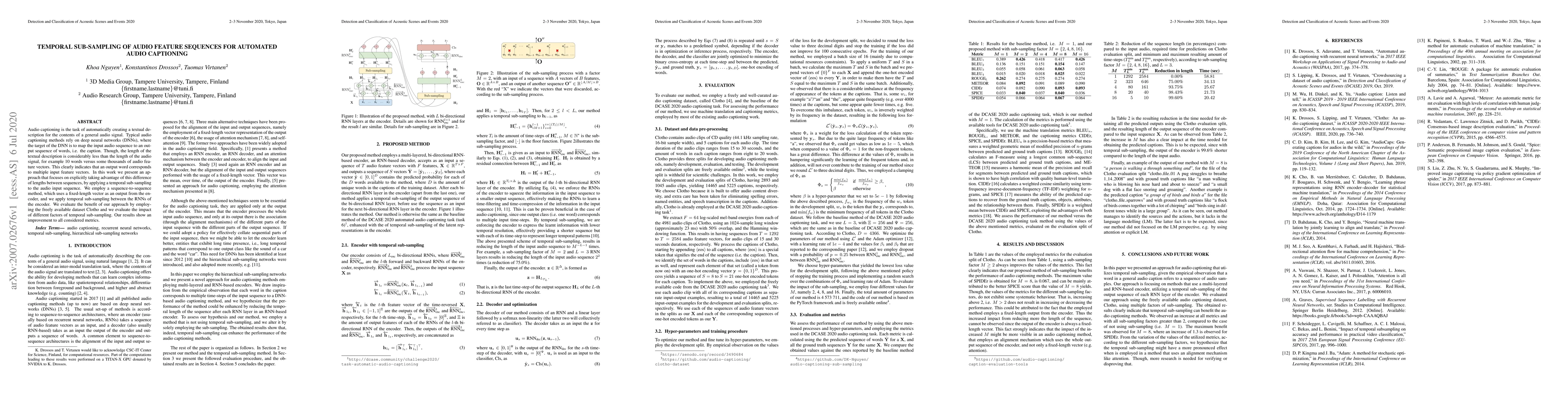 This paper proposes a temporal sub-sampling method for audio captioning, leveraging the difference in length between audio feature sequences and textual descriptions. The approach uses a sequence-to-sequence model with temporal sub-sampling between RNNs in the encoder, showing improved performance on the Clotho dataset.