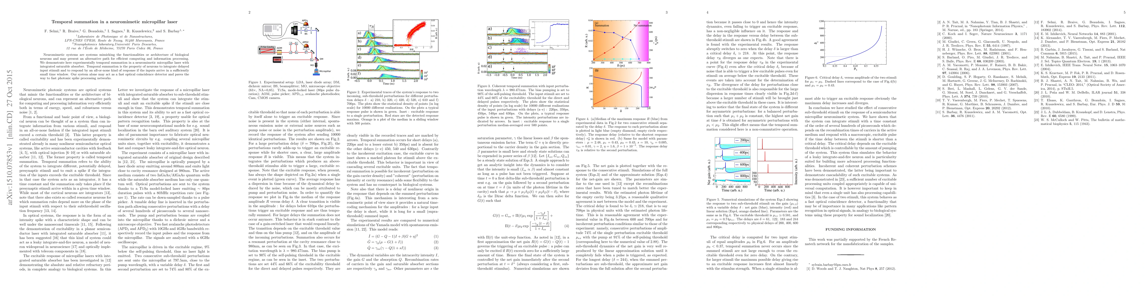This paper demonstrates temporal summation in a neuromimetic micropillar laser with an integrated saturable absorber, showcasing the system's ability to integrate delayed input stimuli and respond with an all-or-none response, potentially serving as a fast optical coincidence detector for photonic spike processing networks.