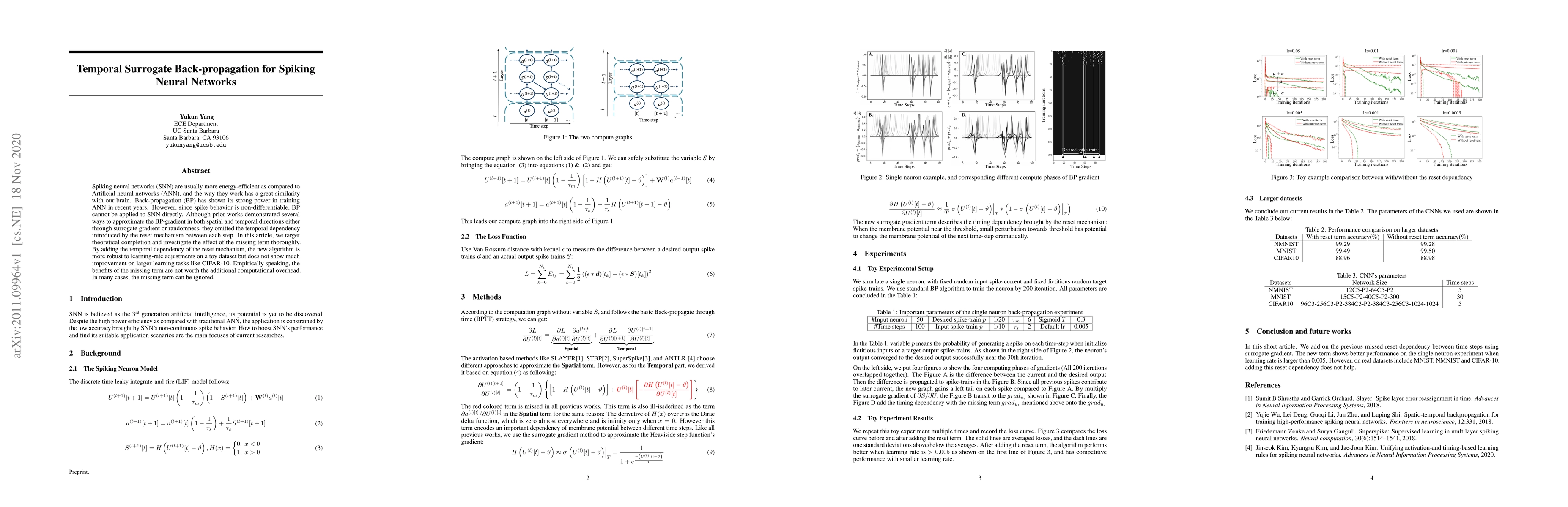 This paper proposes a new temporal surrogate back-propagation method for training spiking neural networks, addressing the temporal dependency of the reset mechanism. While the new algorithm is more robust on small datasets, it does not significantly improve performance on larger datasets like CIFAR-10 and adds unnecessary computational overhead.