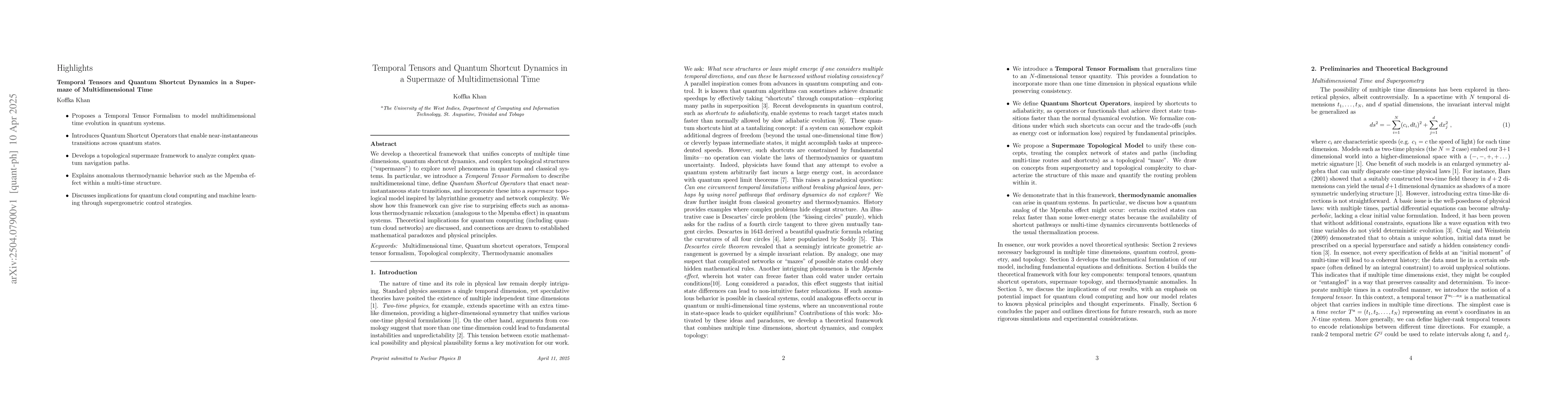 We develop a theoretical framework that unifies concepts of multiple time dimensions, quantum shortcut dynamics, and complex topological structures ('supermazes') to explore novel phenomena in quantum and classical systems. In particular, we introduce a Temporal Tensor Formalism to describe multidimensional time, define Quantum Shortcut Operators that enact near-instantaneous state transitions, and incorporate these into a supermaze topological model inspired by labyrinthine geometry and network complexity. We show how this framework can give rise to surprising effects such as anomalous thermodynamic relaxation (analogous to the Mpemba effect) in quantum systems. Theoretical implications for quantum computing (including quantum cloud networks) are discussed, and connections are drawn to established mathematical paradoxes and physical principles.