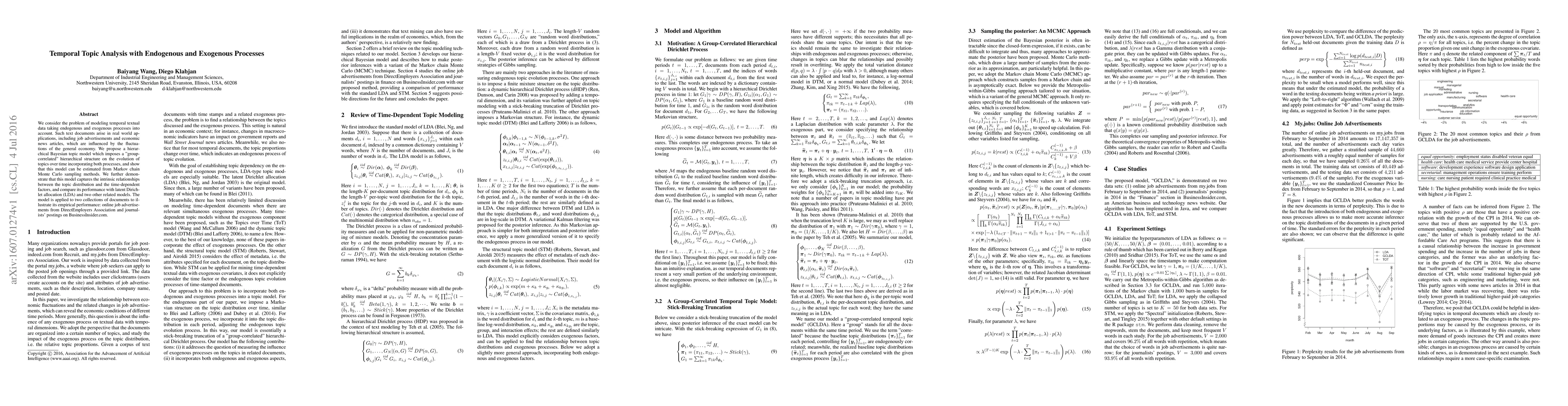This paper proposes a hierarchical Bayesian topic model to analyze temporal textual data, incorporating both endogenous and exogenous processes. The model demonstrates improved performance over LDA and other related models, as shown through applications to job advertisements and economic news articles.