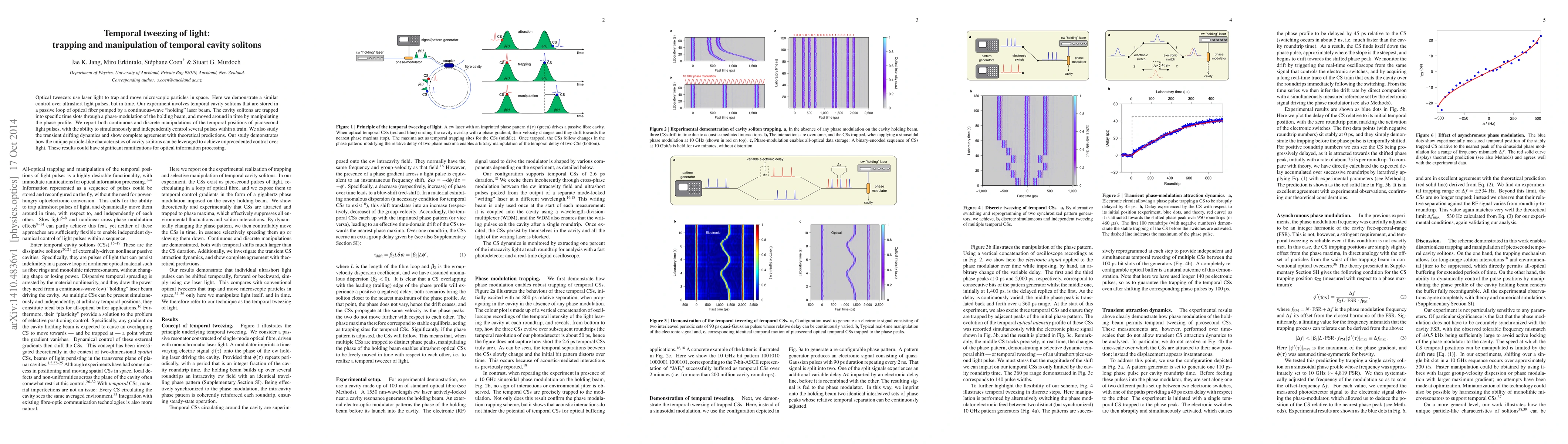 This paper demonstrates the manipulation of temporal cavity solitons using phase-modulated laser beams to trap and move ultrashort light pulses in time, achieving both continuous and discrete control over multiple pulses. The study validates theoretical predictions and highlights the potential for advanced optical information processing.