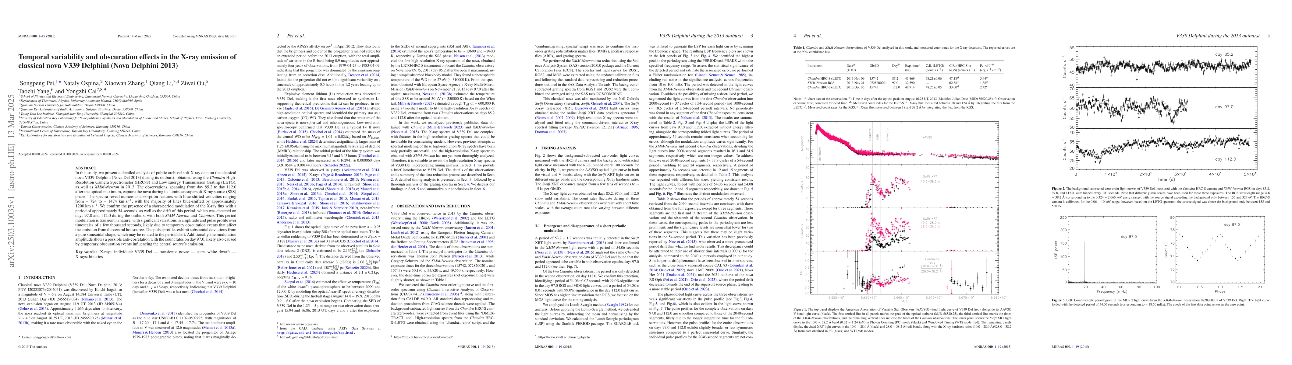 This study analyzes soft X-ray data from the 2013 classical nova V339 Delphini, revealing transient modulations in the X-ray flux with a period of ~54 seconds, likely due to temporary obscuration events affecting the central hot source. The spectra show blue-shifted absorption features and deviations from a sinusoidal pulse profile, suggesting period drift and modulation amplitude variations.