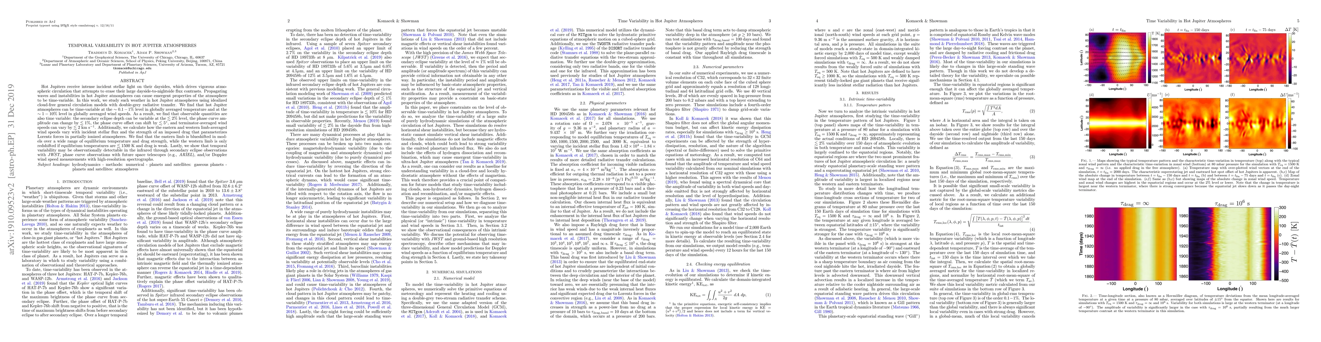This paper investigates the temporal variability in hot Jupiter atmospheres using cloud-free general circulation models, finding significant variability in temperature and wind speeds. It suggests that observable quantities like secondary eclipse depth and phase curve characteristics can also vary, potentially detectable with future telescopes.