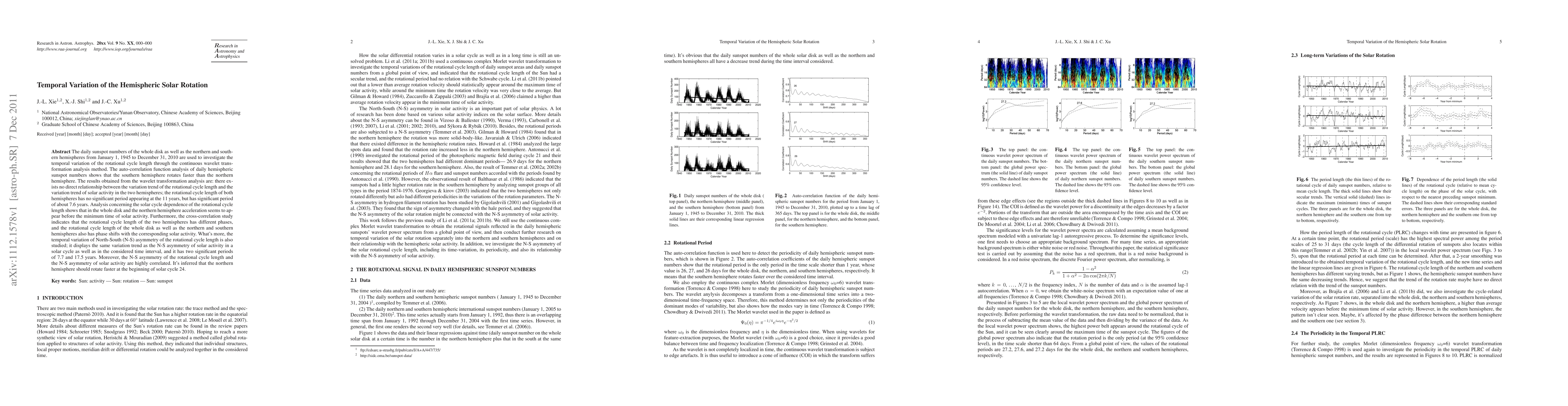 This study uses sunspot data from 1945-2010 to analyze the rotational cycles of the Sun's northern and southern hemispheres. Key findings include the southern hemisphere rotating faster than the northern one, no 11-year period in rotational cycle length variations, significant 7.6-year periods, and a potential 7.7-year period in North-South asymmetry. The research suggests the northern hemisphere may rotate faster at the start of solar cycle 24.