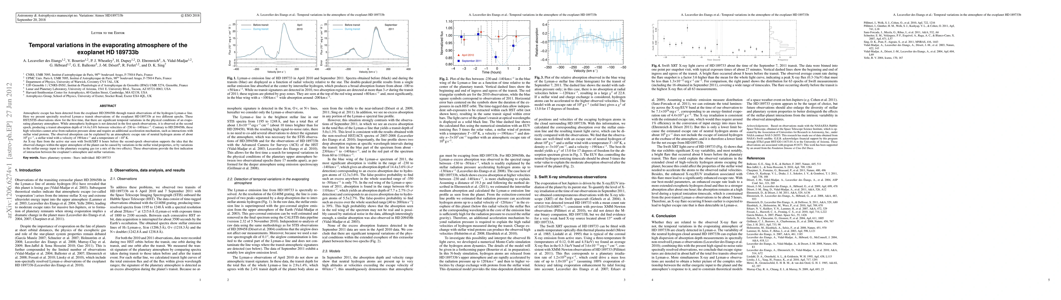 This paper reports significant temporal variations in the evaporating atmosphere of the exoplanet HD 189733b, detected through HST/STIS observations of the hydrogen Lyman-alpha line at two different epochs. The study finds evidence of atmospheric escape and suggests that variations in stellar wind properties or energy input may drive these changes.
