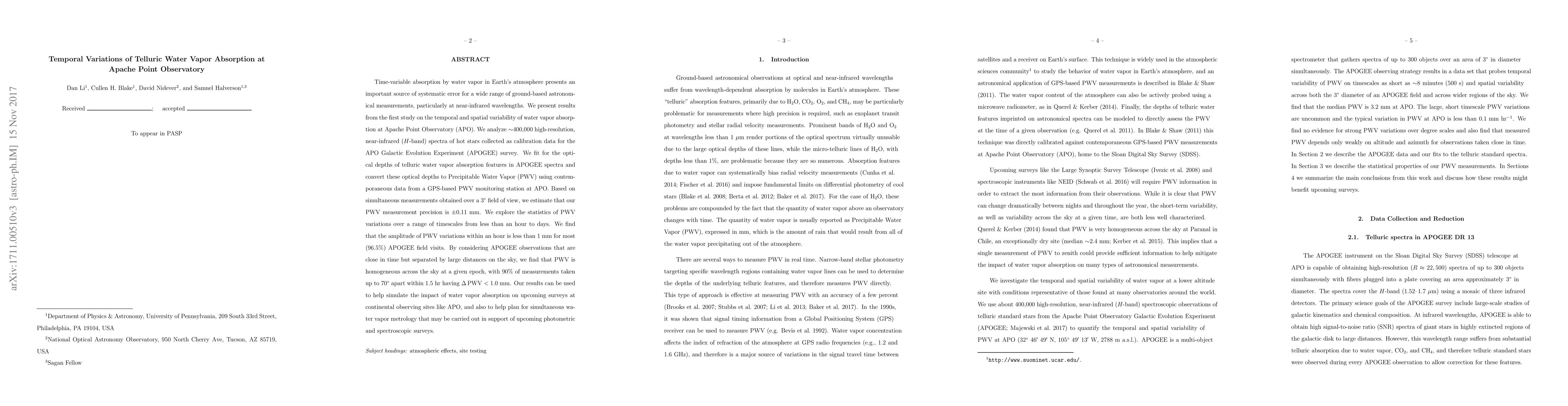 This study analyzes temporal and spatial variability of water vapor absorption at Apache Point Observatory (APO) using nearly 400,000 near-infrared spectra. It finds that within an hour, 96.5% of measurements show PWV variations less than 1 mm, and PWV is homogeneous across the sky within 1.5 hours for observations up to 70° apart.