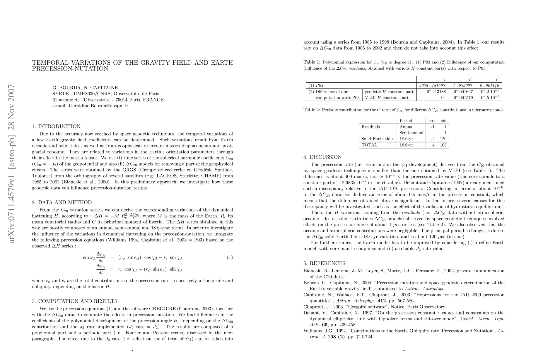 This paper investigates the temporal variations in Earth's gravity field and their impact on Earth's precession-nutation, using advanced space geodetic techniques. The study refines the understanding of Earth's rotation by incorporating gravity field data from CHAMP and comparing it with existing models.