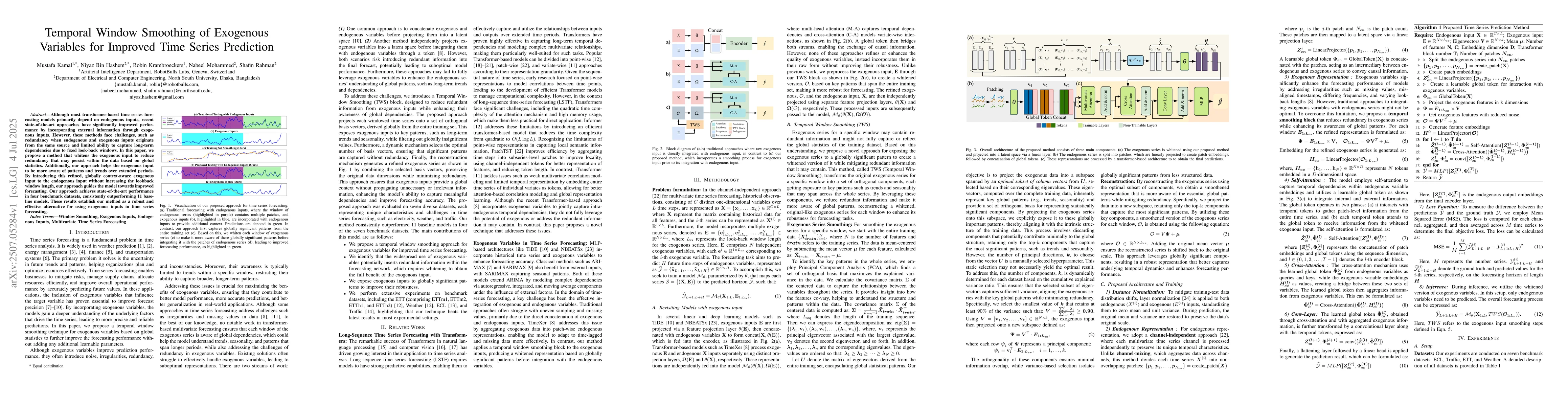 Although most transformer-based time series forecasting models primarily depend on endogenous inputs, recent state-of-the-art approaches have significantly improved performance by incorporating external information through exogenous inputs. However, these methods face challenges, such as redundancy when endogenous and exogenous inputs originate from the same source and limited ability to capture long-term dependencies due to fixed look-back windows. In this paper, we propose a method that whitens the exogenous input to reduce redundancy that may persist within the data based on global statistics. Additionally, our approach helps the exogenous input to be more aware of patterns and trends over extended periods. By introducing this refined, globally context-aware exogenous input to the endogenous input without increasing the lookback window length, our approach guides the model towards improved forecasting. Our approach achieves state-of-the-art performance in four benchmark datasets, consistently outperforming 11 baseline models. These results establish our method as a robust and effective alternative for using exogenous inputs in time series forecasting.
