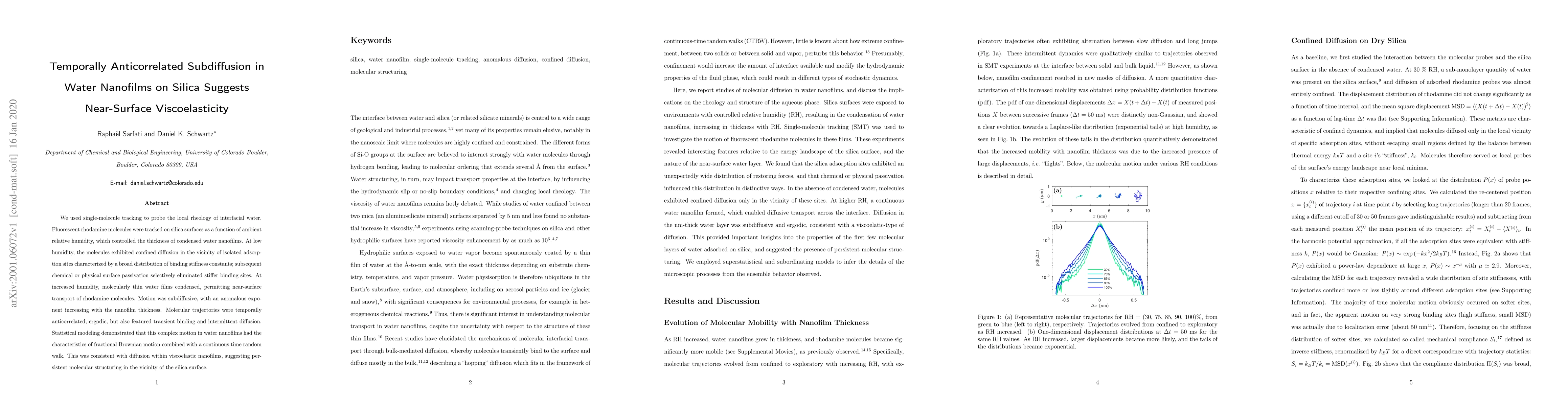 We used single-molecule tracking to probe the local rheology of interfacial water. Fluorescent rhodamine molecules were tracked on silica surfaces as a function of ambient relative humidity, which controlled the thickness of condensed water nanofilms. At low humidity, the molecules exhibited confined diffusion in the vicinity of isolated adsorption sites characterized by a broad distribution of binding stiffness constants; subsequent chemical or physical surface passivation selectively eliminated stiffer binding sites. At increased humidity, molecularly thin water films condensed, permitting near-surface transport of rhodamine molecules. Motion was subdiffusive, with an anomalous exponent increasing with the nanofilm thickness. Molecular trajectories were temporally anticorrelated, ergodic, but also featured transient binding and intermittent diffusion. Statistical modeling demonstrated that this complex motion in water nanofilms had the characteristics of fractional Brownian motion combined with a continuous time random walk. This was consistent with diffusion within viscoelastic nanofilms, suggesting persistent molecular structuring in the vicinity of the silica surface.