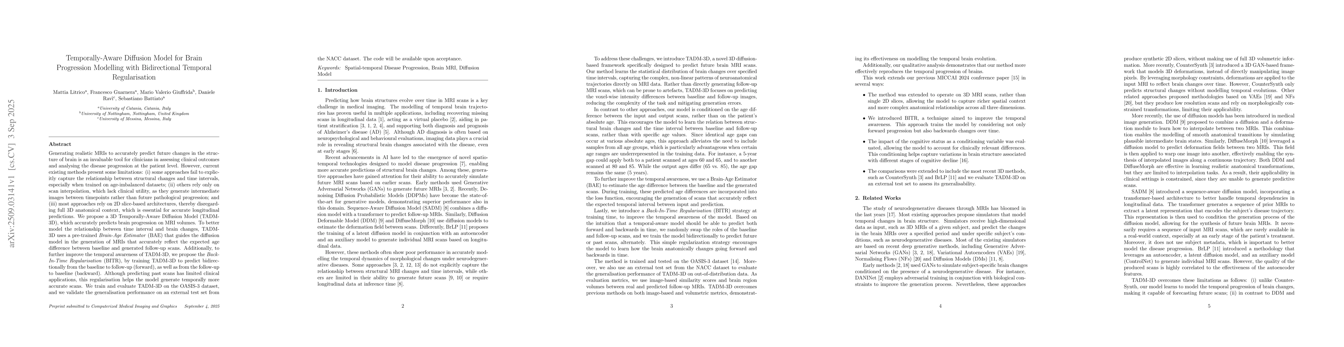 Generating realistic MRIs to accurately predict future changes in the structure of brain is an invaluable tool for clinicians in assessing clinical outcomes and analysing the disease progression at the patient level. However, current existing methods present some limitations: (i) some approaches fail to explicitly capture the relationship between structural changes and time intervals, especially when trained on age-imbalanced datasets; (ii) others rely only on scan interpolation, which lack clinical utility, as they generate intermediate images between timepoints rather than future pathological progression; and (iii) most approaches rely on 2D slice-based architectures, thereby disregarding full 3D anatomical context, which is essential for accurate longitudinal predictions. We propose a 3D Temporally-Aware Diffusion Model (TADM-3D), which accurately predicts brain progression on MRI volumes. To better model the relationship between time interval and brain changes, TADM-3D uses a pre-trained Brain-Age Estimator (BAE) that guides the diffusion model in the generation of MRIs that accurately reflect the expected age difference between baseline and generated follow-up scans. Additionally, to further improve the temporal awareness of TADM-3D, we propose the Back-In-Time Regularisation (BITR), by training TADM-3D to predict bidirectionally from the baseline to follow-up (forward), as well as from the follow-up to baseline (backward). Although predicting past scans has limited clinical applications, this regularisation helps the model generate temporally more accurate scans. We train and evaluate TADM-3D on the OASIS-3 dataset, and we validate the generalisation performance on an external test set from the NACC dataset. The code will be available upon acceptance.