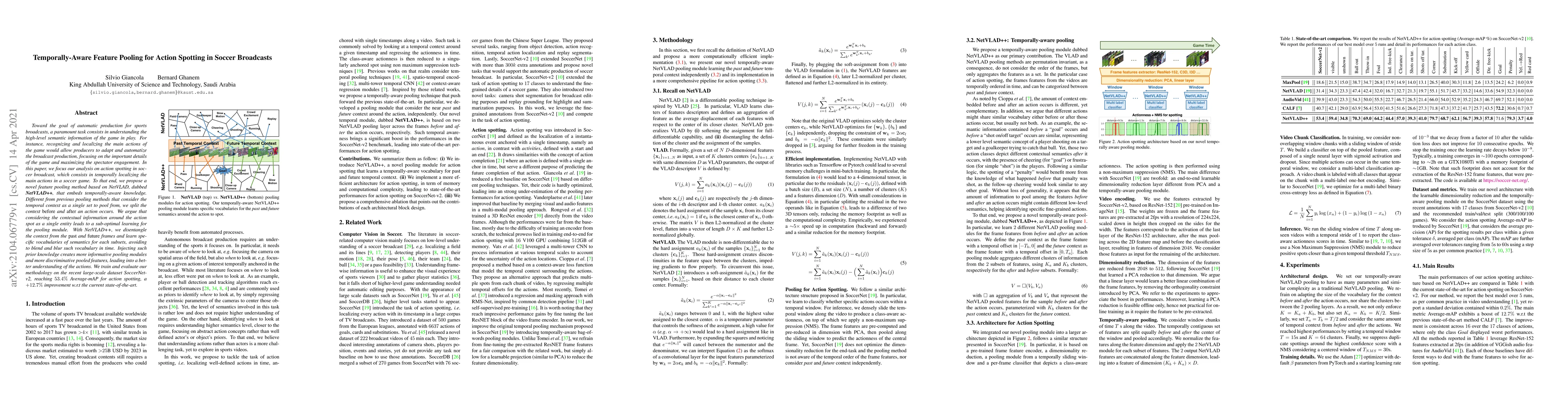 Toward the goal of automatic production for sports broadcasts, a paramount task consists in understanding the high-level semantic information of the game in play. For instance, recognizing and localizing the main actions of the game would allow producers to adapt and automatize the broadcast production, focusing on the important details of the game and maximizing the spectator engagement. In this paper, we focus our analysis on action spotting in soccer broadcast, which consists in temporally localizing the main actions in a soccer game. To that end, we propose a novel feature pooling method based on NetVLAD, dubbed NetVLAD++, that embeds temporally-aware knowledge. Different from previous pooling methods that consider the temporal context as a single set to pool from, we split the context before and after an action occurs. We argue that considering the contextual information around the action spot as a single entity leads to a sub-optimal learning for the pooling module. With NetVLAD++, we disentangle the context from the past and future frames and learn specific vocabularies of semantics for each subsets, avoiding to blend and blur such vocabulary in time. Injecting such prior knowledge creates more informative pooling modules and more discriminative pooled features, leading into a better understanding of the actions. We train and evaluate our methodology on the recent large-scale dataset SoccerNet-v2, reaching 53.4% Average-mAP for action spotting, a +12.7% improvement w.r.t the current state-of-the-art.