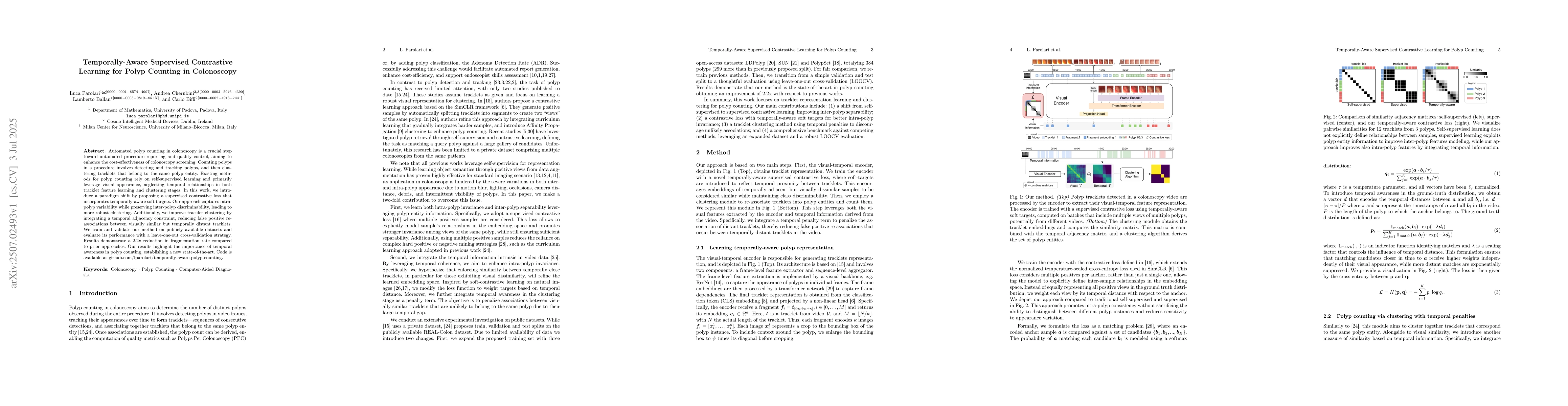 Automated polyp counting in colonoscopy is a crucial step toward automated procedure reporting and quality control, aiming to enhance the cost-effectiveness of colonoscopy screening. Counting polyps in a procedure involves detecting and tracking polyps, and then clustering tracklets that belong to the same polyp entity. Existing methods for polyp counting rely on self-supervised learning and primarily leverage visual appearance, neglecting temporal relationships in both tracklet feature learning and clustering stages. In this work, we introduce a paradigm shift by proposing a supervised contrastive loss that incorporates temporally-aware soft targets. Our approach captures intra-polyp variability while preserving inter-polyp discriminability, leading to more robust clustering. Additionally, we improve tracklet clustering by integrating a temporal adjacency constraint, reducing false positive re-associations between visually similar but temporally distant tracklets. We train and validate our method on publicly available datasets and evaluate its performance with a leave-one-out cross-validation strategy. Results demonstrate a 2.2x reduction in fragmentation rate compared to prior approaches. Our results highlight the importance of temporal awareness in polyp counting, establishing a new state-of-the-art. Code is available at https://github.com/lparolari/temporally-aware-polyp-counting.