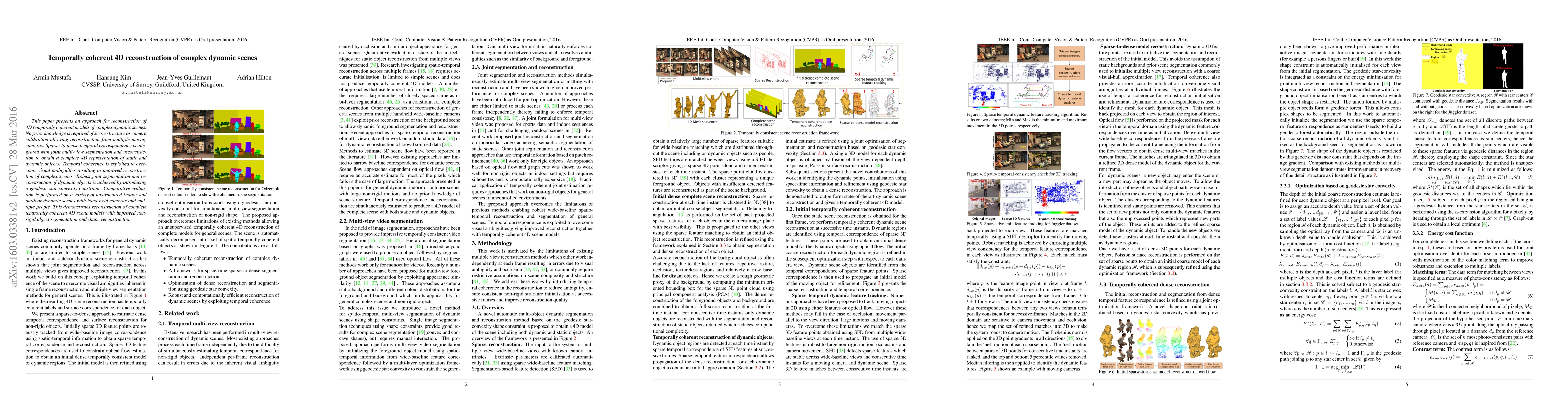 This paper presents an approach for reconstruction of 4D temporally coherent models of complex dynamic scenes. No prior knowledge is required of scene structure or camera calibration allowing reconstruction from multiple moving cameras. Sparse-to-dense temporal correspondence is integrated with joint multi-view segmentation and reconstruction to obtain a complete 4D representation of static and dynamic objects. Temporal coherence is exploited to overcome visual ambiguities resulting in improved reconstruction of complex scenes. Robust joint segmentation and reconstruction of dynamic objects is achieved by introducing a geodesic star convexity constraint. Comparative evaluation is performed on a variety of unstructured indoor and outdoor dynamic scenes with hand-held cameras and multiple people. This demonstrates reconstruction of complete temporally coherent 4D scene models with improved nonrigid object segmentation and shape reconstruction.