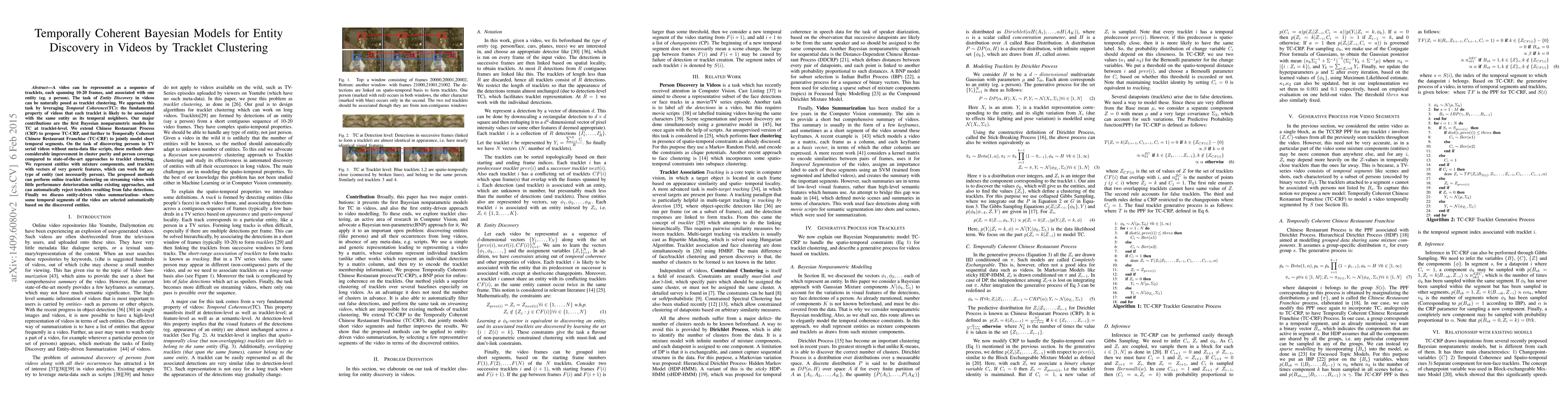 A video can be represented as a sequence of tracklets, each spanning 10-20 frames, and associated with one entity (eg. a person). The task of \emph{Entity Discovery} in videos can be naturally posed as tracklet clustering. We approach this task by leveraging \emph{Temporal Coherence}(TC): the fundamental property of videos that each tracklet is likely to be associated with the same entity as its temporal neighbors. Our major contributions are the first Bayesian nonparametric models for TC at tracklet-level. We extend Chinese Restaurant Process (CRP) to propose TC-CRP, and further to Temporally Coherent Chinese Restaurant Franchise (TC-CRF) to jointly model short temporal segments. On the task of discovering persons in TV serial videos without meta-data like scripts, these methods show considerable improvement in cluster purity and person coverage compared to state-of-the-art approaches to tracklet clustering. We represent entities with mixture components, and tracklets with vectors of very generic features, which can work for any type of entity (not necessarily person). The proposed methods can perform online tracklet clustering on streaming videos with little performance deterioration unlike existing approaches, and can automatically reject tracklets resulting from false detections. Finally we discuss entity-driven video summarization- where some temporal segments of the video are selected automatically based on the discovered entities.