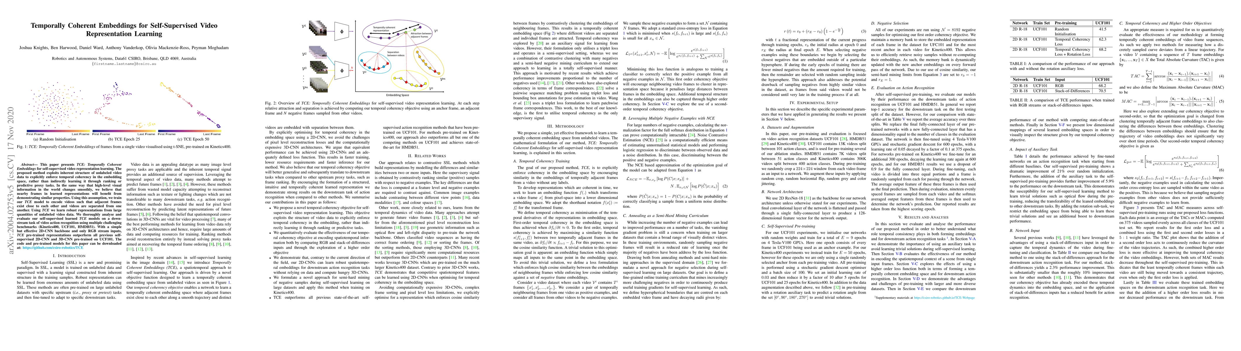 This paper presents TCE: Temporally Coherent Embeddings for self-supervised video representation learning. The proposed method exploits inherent structure of unlabeled video data to explicitly enforce temporal coherency in the embedding space, rather than indirectly learning it through ranking or predictive proxy tasks. In the same way that high-level visual information in the world changes smoothly, we believe that nearby frames in learned representations will benefit from demonstrating similar properties. Using this assumption, we train our TCE model to encode videos such that adjacent frames exist close to each other and videos are separated from one another. Using TCE we learn robust representations from large quantities of unlabeled video data. We thoroughly analyse and evaluate our self-supervised learned TCE models on a downstream task of video action recognition using multiple challenging benchmarks (Kinetics400, UCF101, HMDB51). With a simple but effective 2D-CNN backbone and only RGB stream inputs, TCE pre-trained representations outperform all previous selfsupervised 2D-CNN and 3D-CNN pre-trained on UCF101. The code and pre-trained models for this paper can be downloaded at: https://github.com/csiro-robotics/TCE