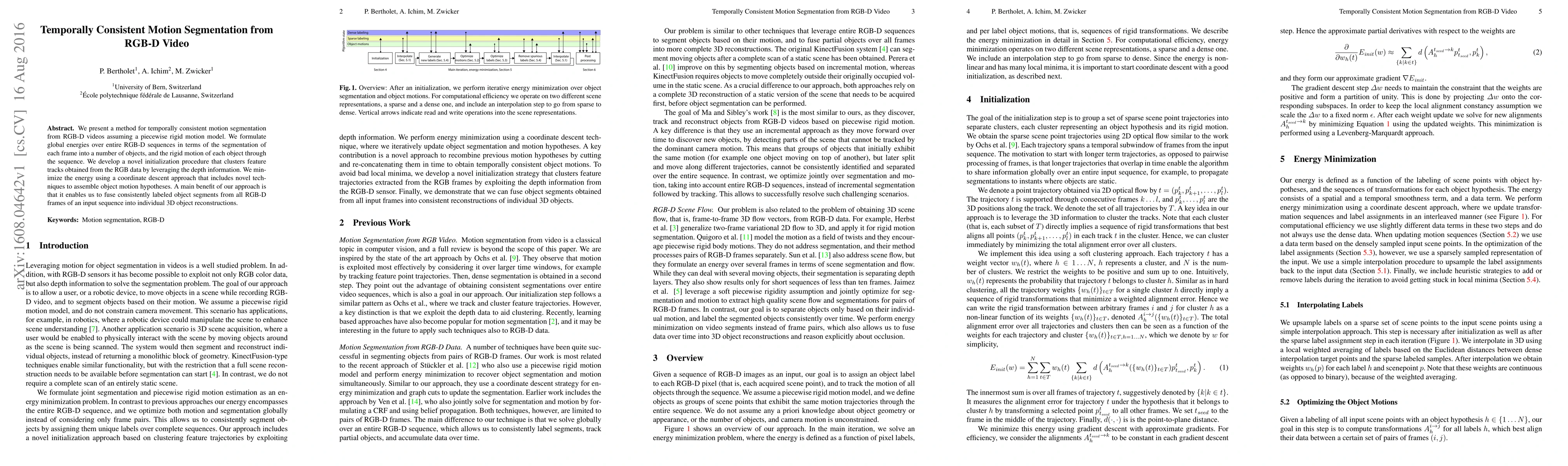 The paper presents a method for temporally consistent motion segmentation from RGB-D videos, based on a piecewise rigid motion model. It formulates global energies over entire sequences and develops a novel initialization procedure leveraging depth information for clustering feature tracks. The approach minimizes energy using a coordinate descent approach with novel techniques for assembling object motion hypotheses.
