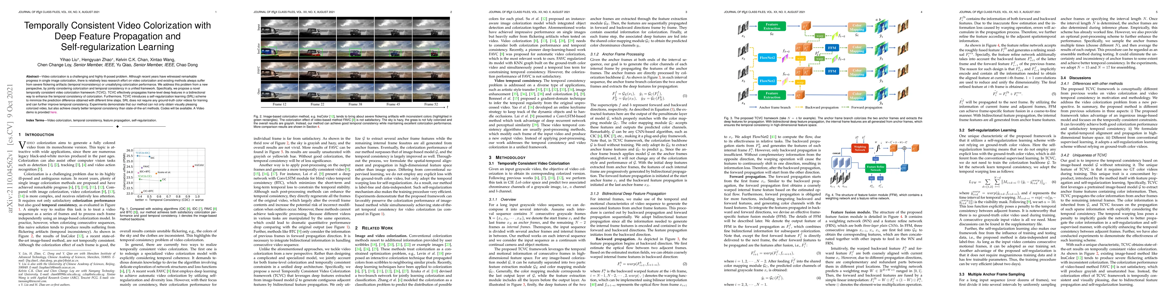 This paper proposes a novel framework for temporally consistent video colorization (TCVC) that leverages bidirectional deep feature propagation and self-regularization learning to minimize flickering artifacts and enhance colorization performance across video frames. The method achieves superior temporal consistency and colorization quality compared to existing approaches.
